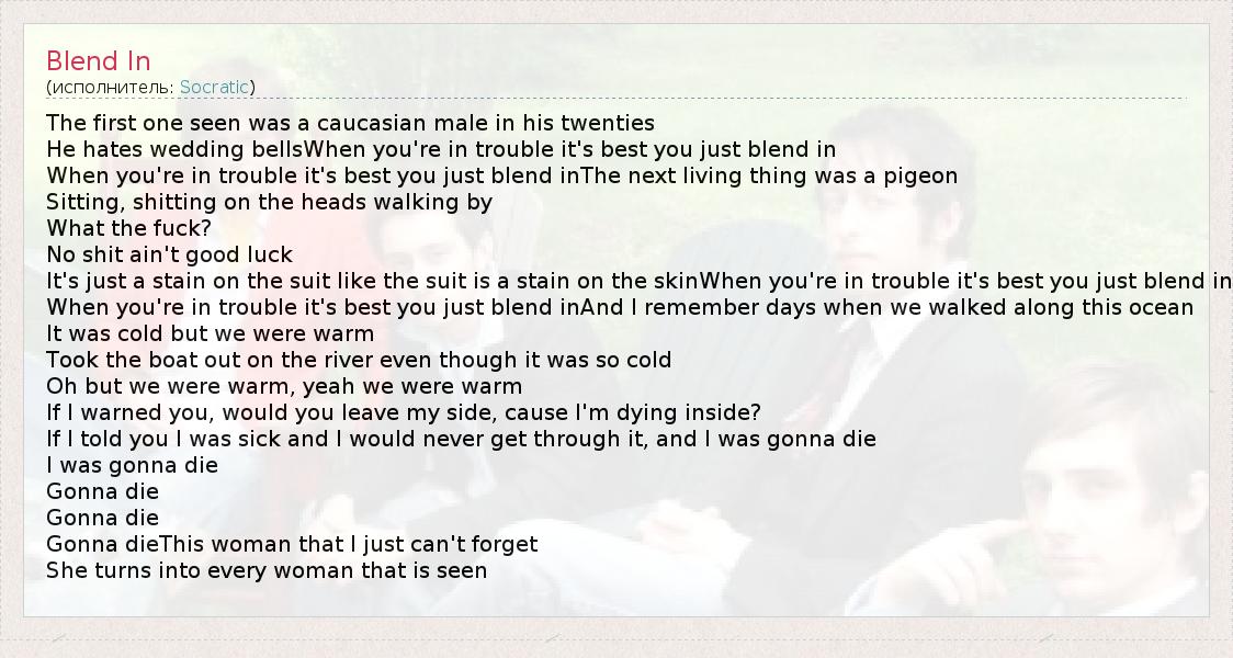 When you're in trouble it's best you just blend inAnd I remember days when we walked along this ocean