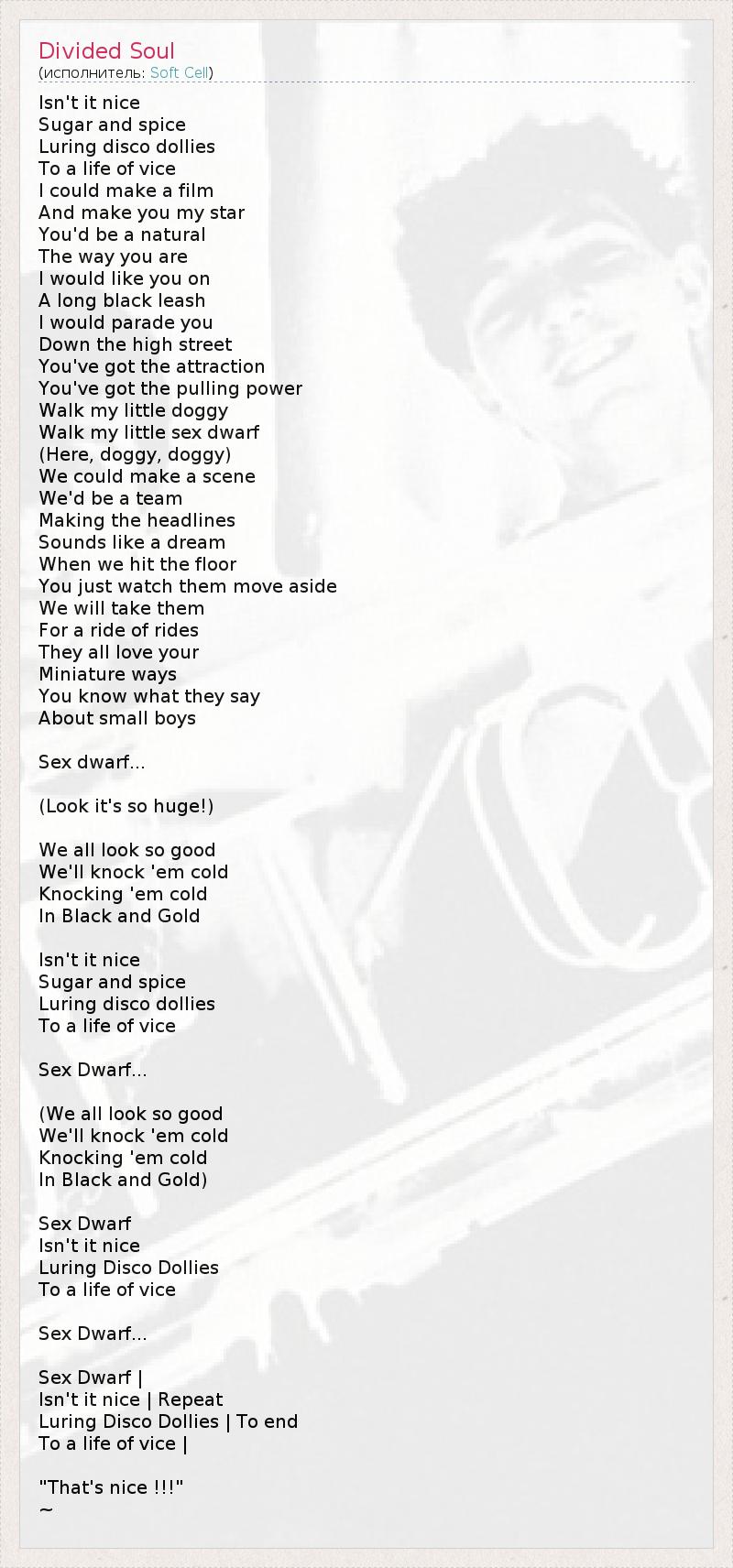 Isn't it nice Sugar and spice Luring disco dollies To a life of vice I could make a film And make you my star You'd be a natural The way you are I would like you on A long black leash I would parade you Down the high street You've got the attraction You've got the pulling power Walk my little doggy Walk my little sex dwarf (Here, doggy, doggy) We could make a scene We'd be a team Making the headlines Sounds like a dream When we hit the floor You just watch them move aside We will take them For a ride of rides They all love your Miniature ways You know what they say About small boys Sex dwarf... (Look it's so huge!) We all look so good We'll knock 'em cold Knocking 'em cold In Black and Gold Isn't it nice Sugar and spice Luring disco dollies To a life of vice Sex Dwarf... (We all look so good We'll knock 'em cold Knocking 'em cold In Black and Gold) Sex Dwarf Isn't it nice Luring Disco Dollies To a life of vice Sex Dwarf... Sex Dwarf | Isn't it nice | Repeat Luring Disco Dollies | To end To a life of vice | "That's nice !!!" ~