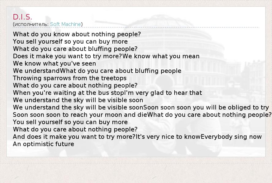 What do you know about nothing people? You sell yourself so you can buy more What do you care about bluffing people? Does it make you want to try more?We know what you mean We know what you've seen We understandWhat do you care about bluffing people Throwing sparrows from the treetops What do you care about nothing people? When you're waiting at the bus stopI'm very glad to hear that We understand the sky will be visible soon We understand the sky will be visible soonSoon soon soon you will be obliged to try Soon soon soon to reach your moon and dieWhat do you care about nothing people? You sell yourself so you can buy more What do you care about nothing people? And does it make you want to try more?It's very nice to knowEverybody sing now An optimistic future