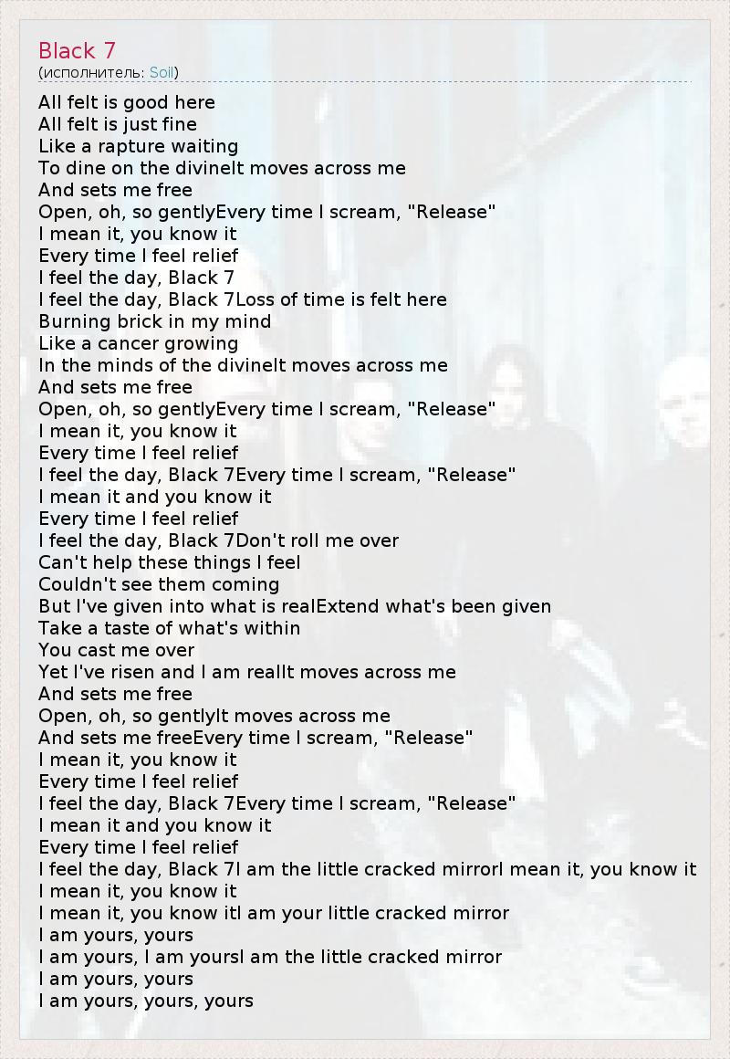 All felt is good here All felt is just fine Like a rapture waiting To dine on the divineIt moves across me And sets me free Open, oh, so gentlyEvery time I scream, "Release" I mean it, you know it Every time I feel relief I feel the day, Black 7 I feel the day, Black 7Loss of time is felt here Burning brick in my mind Like a cancer growing In the minds of the divineIt moves across me And sets me free Open, oh, so gentlyEvery time I scream, "Release" I mean it, you know it Every time I feel relief I feel the day, Black 7Every time I scream, "Release" I mean it and you know it Every time I feel relief I feel the day, Black 7Don't roll me over Can't help these things I feel Couldn't see them coming But I've given into what is realExtend what's been given Take a taste of what's within You cast me over Yet I've risen and I am realIt moves across me And sets me free Open, oh, so gentlyIt moves across me And sets me freeEvery time I scream, "Release" I mean it, you know it Every time I feel relief I feel the day, Black 7Every time I scream, "Release" I mean it and you know it Every time I feel relief I feel the day, Black 7I am the little cracked mirrorI mean it, you know it I mean it, you know it I mean it, you know itI am your little cracked mirror I am yours, yours I am yours, I am yoursI am the little cracked mirror I am yours, yours I am yours, yours, yours