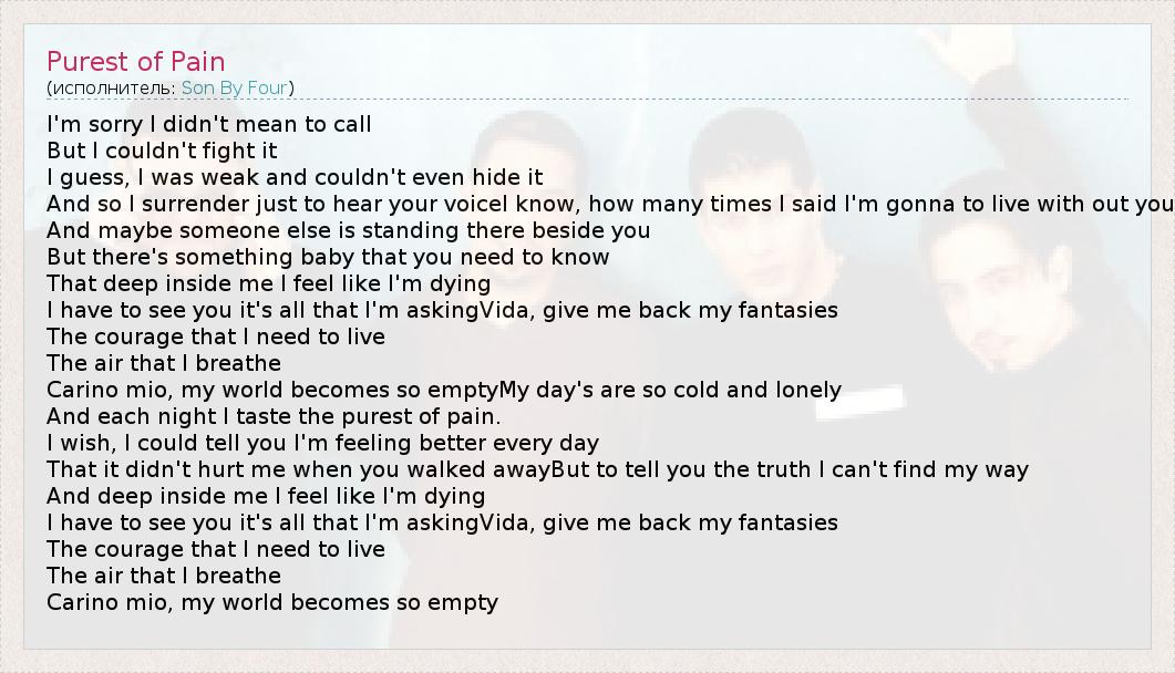 I'm sorry I didn't mean to call But I couldn't fight it I guess, I was weak and couldn't even hide it And so I surrender just to hear your voiceI know, how many times I said I'm gonna to live with out you And maybe someone else is standing there beside you But there's something baby that you need to know That deep inside me I feel like I'm dying I have to see you it's all that I'm askingVida, give me back my fantasies The courage that I need to live The air that I breathe Carino mio, my world becomes so emptyMy day's are so cold and lonely And each night I taste the purest of pain. I wish, I could tell you I'm feeling better every day That it didn't hurt me when you walked awayBut to tell you the truth I can't find my way And deep inside me I feel like I'm dying I have to see you it's all that I'm askingVida, give me back my fantasies The courage that I need to live The air that I breathe Carino mio, my world becomes so empty
