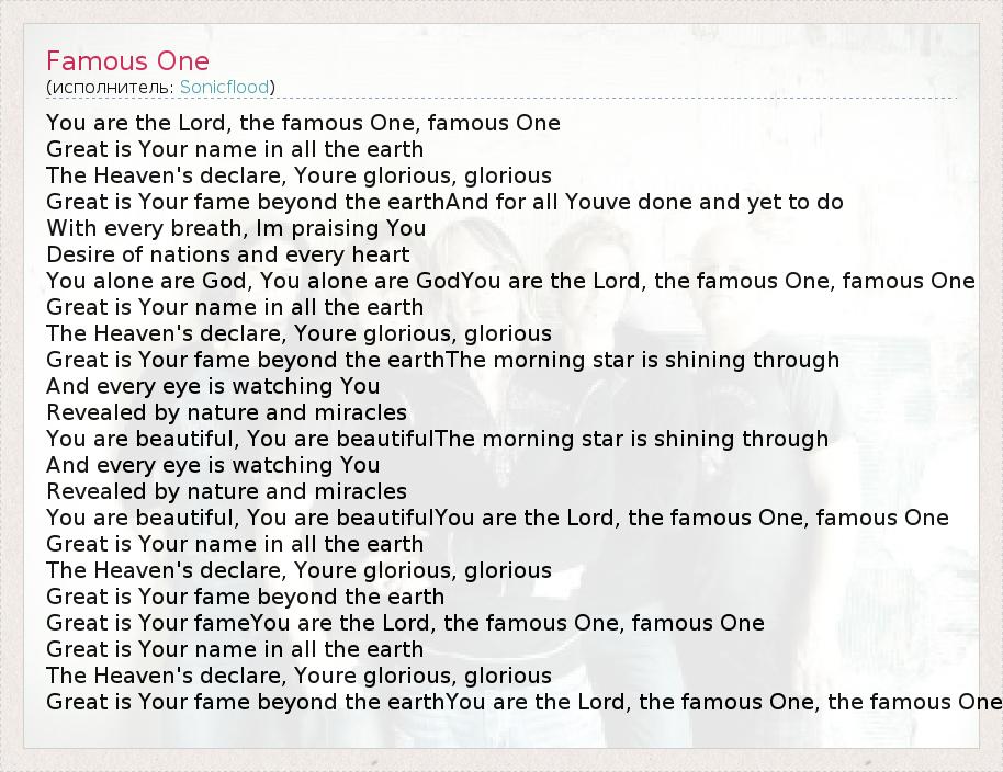 Great is Your fame beyond the earthYou are the Lord, the famous One, the famous One