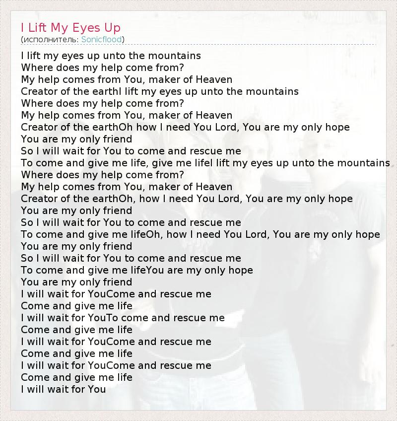 I lift my eyes up unto the mountains Where does my help come from? My help comes from You, maker of Heaven Creator of the earthI lift my eyes up unto the mountains Where does my help come from? My help comes from You, maker of Heaven Creator of the earthOh how I need You Lord, You are my only hope You are my only friend So I will wait for You to come and rescue me To come and give me life, give me lifeI lift my eyes up unto the mountains Where does my help come from? My help comes from You, maker of Heaven Creator of the earthOh, how I need You Lord, You are my only hope You are my only friend So I will wait for You to come and rescue me To come and give me lifeOh, how I need You Lord, You are my only hope You are my only friend So I will wait for You to come and rescue me To come and give me lifeYou are my only hope You are my only friend I will wait for YouCome and rescue me Come and give me life I will wait for YouTo come and rescue me Come and give me life I will wait for YouCome and rescue me Come and give me life I will wait for YouCome and rescue me Come and give me life I will wait for You