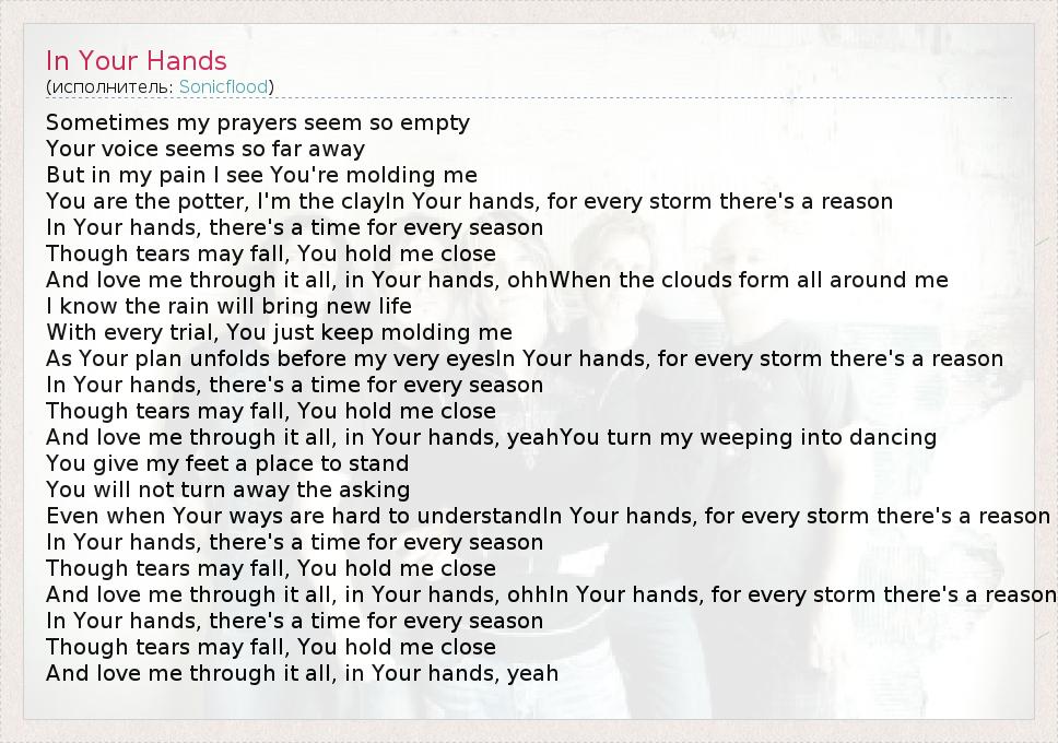 Sometimes my prayers seem so empty Your voice seems so far away But in my pain I see You're molding me You are the potter, I'm the clayIn Your hands, for every storm there's a reason In Your hands, there's a time for every season Though tears may fall, You hold me close And love me through it all, in Your hands, ohhWhen the clouds form all around me I know the rain will bring new life With every trial, You just keep molding me As Your plan unfolds before my very eyesIn Your hands, for every storm there's a reason In Your hands, there's a time for every season Though tears may fall, You hold me close And love me through it all, in Your hands, yeahYou turn my weeping into dancing You give my feet a place to stand You will not turn away the asking Even when Your ways are hard to understandIn Your hands, for every storm there's a reason In Your hands, there's a time for every season Though tears may fall, You hold me close And love me through it all, in Your hands, ohhIn Your hands, for every storm there's a reason In Your hands, there's a time for every season Though tears may fall, You hold me close And love me through it all, in Your hands, yeah