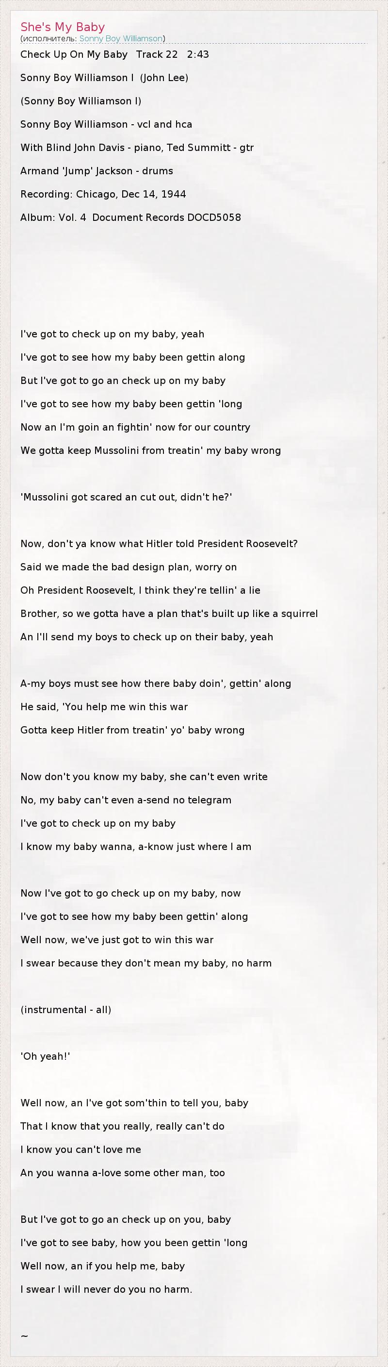Это интересно:На самом деле этого музыканта звали Джон Ли Уильямсон (John Lee Williamson). Родился он 30 марта 1914 года, а погиб 1 июня 1948. Один из самых значительных блюзменов довоенного времени, Уильямсон почти единолично сделал скромную гармонику едва ли не ведущим инструментом блюза, что и послужило отправным пунктом для последующих удивительных экспериментов таких людей как, например, Литтл Уолтер (Little Walter).... продолжение