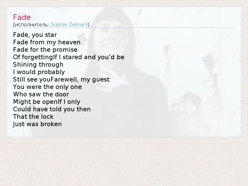 Fade, you star Fade from my heaven Fade for the promise Of forgettingIf I stared and you'd be Shining through I would probably Still see youFarewell, my guest You were the only one Who saw the door Might be openIf I only Could have told you then That the lock Just was broken