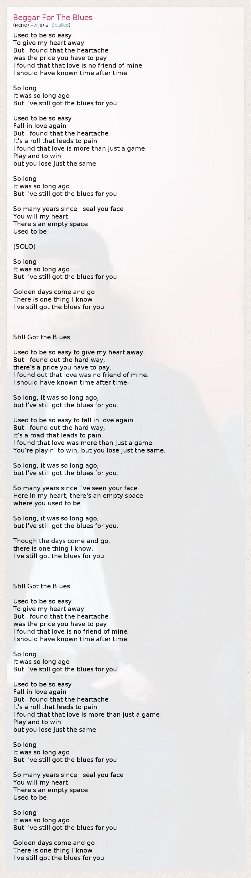 Used to be so easy To give my heart away But I found that the heartache was the price you have to pay I found that that love is no friend of mine I should have known time after time So long It was so long ago But I've still got the blues for you Used to be so easy Fall in love again But I found that the heartache It's a roll that leeds to pain I found that love is more than just a game Play and to win but you lose just the same So long It was so long ago But I've still got the blues for you So many years since I seal you face You will my heart There's an empty space Used to be (SOLO) So long It was so long ago But I've still got the blues for you Golden days come and go There is one thing I know I've still got the blues for you Still Got the Blues Used to be so easy to give my heart away. But I found out the hard way, there's a price you have to pay. I found out that love was no friend of mine. I should have known time after time. So long, it was so long ago, but I've still got the blues for you. Used to be so easy to fall in love again. But I found out the hard way, it's a road that leads to pain. I found that love was more than just a game. You're playin' to win, but you lose just the same. So long, it was so long ago, but I've still got the blues for you. So many years since I've seen your face. Here in my heart, there's an empty space where you used to be. So long, it was so long ago, but I've still got the blues for you. Though the days come and go, there is one thing I know. I've still got the blues for you. Still Got the Blues Used to be so easy To give my heart away But I found that the heartache was the price you have to pay I found that love is no friend of mine I should have known time after time So long It was so long ago But I've still got the blues for you Used to be so easy Fall in love again But I found that the heartache It's a roll that leeds to pain I found that that love is more than just a game Play and to win but you lose just the same So long It was so long ago But I've still got the blues for you So many years since I seal you face You will my heart There's an empty space Used to be So long It was so long ago But I've still got the blues for you Golden days come and go There is one thing I know I've still got the blues for you
