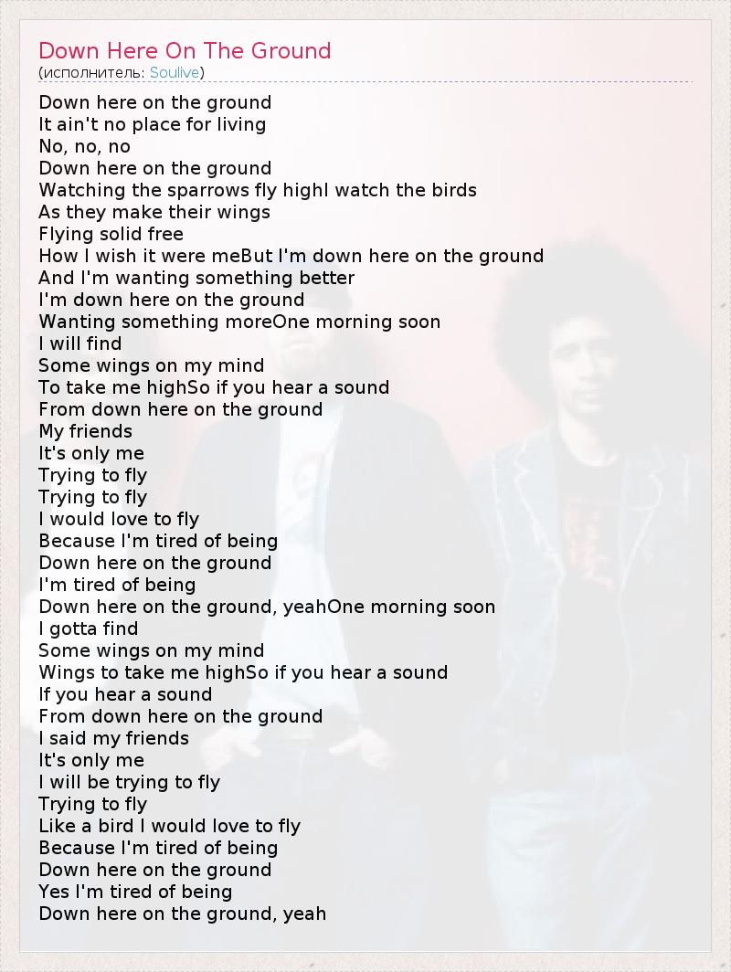 Down here on the ground It ain't no place for living No, no, no Down here on the ground Watching the sparrows fly highI watch the birds As they make their wings Flying solid free How I wish it were meBut I'm down here on the ground And I'm wanting something better I'm down here on the ground Wanting something moreOne morning soon I will find Some wings on my mind To take me highSo if you hear a sound From down here on the ground My friends It's only me Trying to fly Trying to fly I would love to fly Because I'm tired of being Down here on the ground I'm tired of being Down here on the ground, yeahOne morning soon I gotta find Some wings on my mind Wings to take me highSo if you hear a sound If you hear a sound From down here on the ground I said my friends It's only me I will be trying to fly Trying to fly Like a bird I would love to fly Because I'm tired of being Down here on the ground Yes I'm tired of being Down here on the ground, yeah