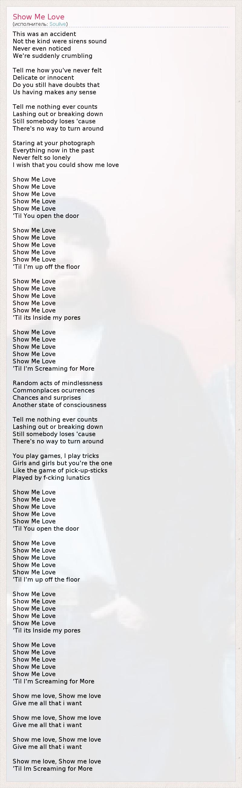 Это был несчастный случай, но звуков скорби не было слышно, Ранее незаметные детали неожиданно привели к поражению Расскажи о том, что ты никогда не знал нежности и непорочности, Ты все еще сомневаешься в нас, Скажи мне, что любое "ничто" находит свое объяснение или просто исчезает. Однако некоторые до сих пор теряются, потому что нет возможности всё вернуть. Смотрю на твое фото и понимаю - все уже в прошлом. Никогда в жизни не чувствовала себя столь одинокой. Покажи мне любовь. Припев: Покажи мне любовь, пока не ушел. Покажи мне любовь, покажи мне любовь, пока я на ногах. Покажи мне любовь, пока есть желание. Покажи мне любовь, пока я снова не заплакала. Напускное безразличие - обычное явление, Желание удивляться - вот чего нам не хватает Кричи, что любое "ничто" находит свое объяснение или просто исчезает. Однако некоторые до сих пор теряются, потому что нет возможности всё вернуть. Расскажи о том, что ты никогда не знал нежности и непорочности Ты все еще сомневаешься в нас Ты играешь в игры, я беру обманом, девочки и девочки, но ты похож На эстафетную палочку, которую передают друг другу лунатики. Припев: