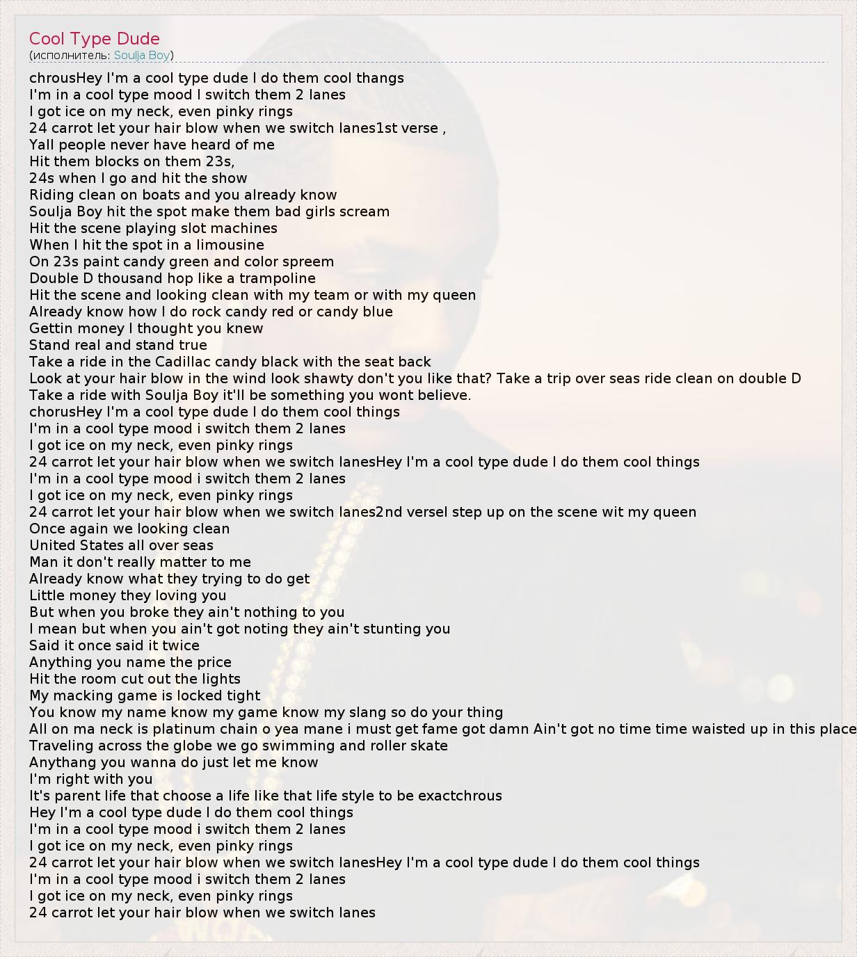 chrousHey I'm a cool type dude I do them cool thangs I'm in a cool type mood I switch them 2 lanes I got ice on my neck, even pinky rings 24 carrot let your hair blow when we switch lanes1st verse , Yall people never have heard of me Hit them blocks on them 23s, 24s when I go and hit the show Riding clean on boats and you already know Soulja Boy hit the spot make them bad girls scream Hit the scene playing slot machines When I hit the spot in a limousine On 23s paint candy green and color spreem Double D thousand hop like a trampoline Hit the scene and looking clean with my team or with my queen Already know how I do rock candy red or candy blue Gettin money I thought you knew Stand real and stand true Take a ride in the Cadillac candy black with the seat back Look at your hair blow in the wind look shawty don't you like that? Take a trip over seas ride clean on double D Take a ride with Soulja Boy it'll be something you wont believe. chorusHey I'm a cool type dude I do them cool things I'm in a cool type mood i switch them 2 lanes I got ice on my neck, even pinky rings 24 carrot let your hair blow when we switch lanesHey I'm a cool type dude I do them cool things I'm in a cool type mood i switch them 2 lanes I got ice on my neck, even pinky rings 24 carrot let your hair blow when we switch lanes2nd verseI step up on the scene wit my queen Once again we looking clean United States all over seas Man it don't really matter to me Already know what they trying to do get Little money they loving you But when you broke they ain't nothing to you I mean but when you ain't got noting they ain't stunting you Said it once said it twice Anything you name the price Hit the room cut out the lights My macking game is locked tight You know my name know my game know my slang so do your thing All on ma neck is platinum chain o yea mane i must get fame got damn Ain't got no time time waisted up in this place Traveling across the globe we go swimming and roller skate Anythang you wanna do just let me know I'm right with you It's parent life that choose a life like that life style to be exactchrous Hey I'm a cool type dude I do them cool things I'm in a cool type mood i switch them 2 lanes I got ice on my neck, even pinky rings 24 carrot let your hair blow when we switch lanesHey I'm a cool type dude I do them cool things I'm in a cool type mood i switch them 2 lanes I got ice on my neck, even pinky rings 24 carrot let your hair blow when we switch lanes