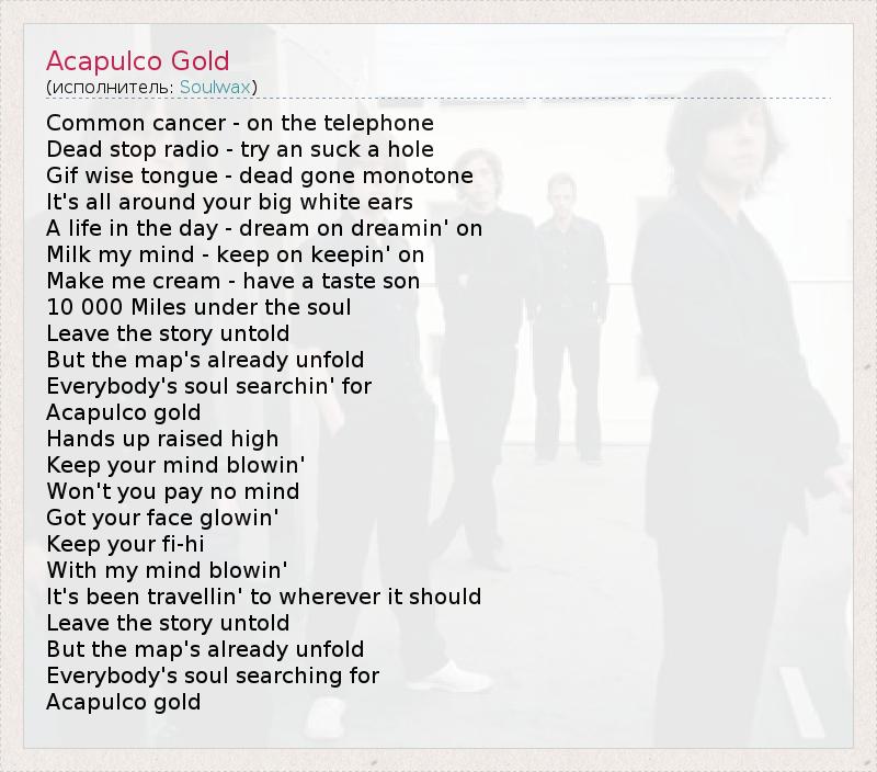 Common cancer - on the telephone Dead stop radio - try an suck a hole Gif wise tongue - dead gone monotone It's all around your big white ears A life in the day - dream on dreamin' on Milk my mind - keep on keepin' on Make me cream - have a taste son 10 000 Miles under the soul Leave the story untold But the map's already unfold Everybody's soul searchin' for Acapulco gold Hands up raised high Keep your mind blowin' Won't you pay no mind Got your face glowin' Keep your fi-hi With my mind blowin' It's been travellin' to wherever it should Leave the story untold But the map's already unfold Everybody's soul searching for Acapulco gold