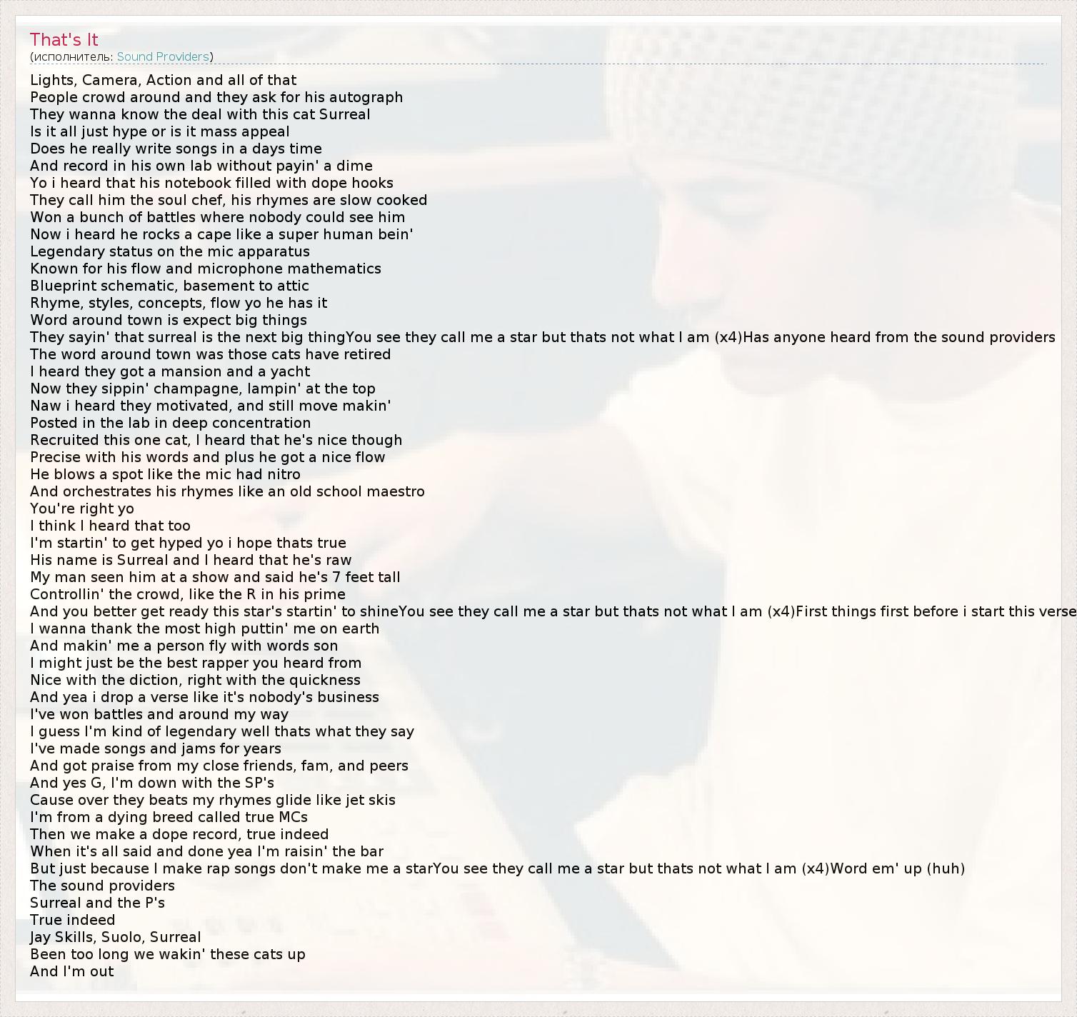 They sayin' that surreal is the next big thingYou see they call me a star but thats not what I am (x4)Has anyone heard from the sound providers