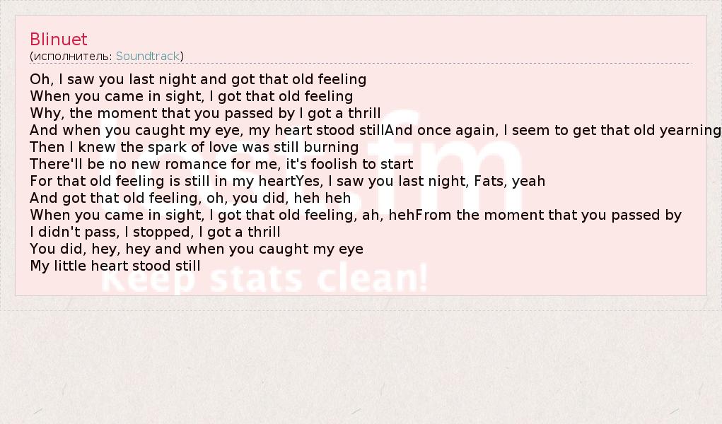 Oh, I saw you last night and got that old feeling When you came in sight, I got that old feeling Why, the moment that you passed by I got a thrill And when you caught my eye, my heart stood stillAnd once again, I seem to get that old yearning Then I knew the spark of love was still burning There'll be no new romance for me, it's foolish to start For that old feeling is still in my heartYes, I saw you last night, Fats, yeah And got that old feeling, oh, you did, heh heh When you came in sight, I got that old feeling, ah, hehFrom the moment that you passed by I didn't pass, I stopped, I got a thrill You did, hey, hey and when you caught my eye My little heart stood still