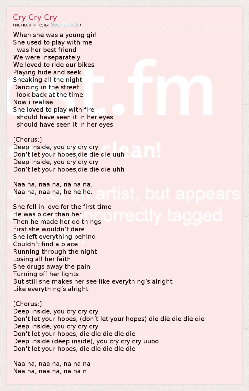 Когда она была маленькой девочкой, Она играла со мной. Мы были лучшими подругами, И мы были неразлучны. Нам нравилось кататься на велосипеде, Играть в прятки, Шататься где-нибудь ночь напролёт Танцевать на улице.... Я вспоминаю это время и сейчас понимаю, что Она любила играть с огнем... Я должна была заметить это в ее глазах... Я должна была заметить это в ее глазах.... [Припев:] Глубоко внутри ты плачешь, плачешь, Не дай своим надеждам умереть, умереть... Глубоко внутри ты плачешь, плачешь, Не дай своим надеждам умереть, умереть... На-на-на... На-на-на... Когда она впервые влюбилась, Он был старше ее. Он заставлял ее делать то, На что она бы не решилась раньше. Она потеряла все, Не найдя себе места, Сбежав в ночи, Потеряв веру в себя. Она заглушила наркотиками боль, Что погасило ее свет Но она заставляет себя верить в то, что всё хорошо, Что всё хорошо... [Припев:] Глубоко внутри ты плачешь, плачешь, Не дай своим надеждам умереть, умереть... Глубоко внутри ты плачешь, плачешь, Не дай своим надеждам умереть, умереть... Глубоко внутри ты плачешь, плачешь, Не дай своим надеждам умереть, умереть... На-на-на... На-на-на...