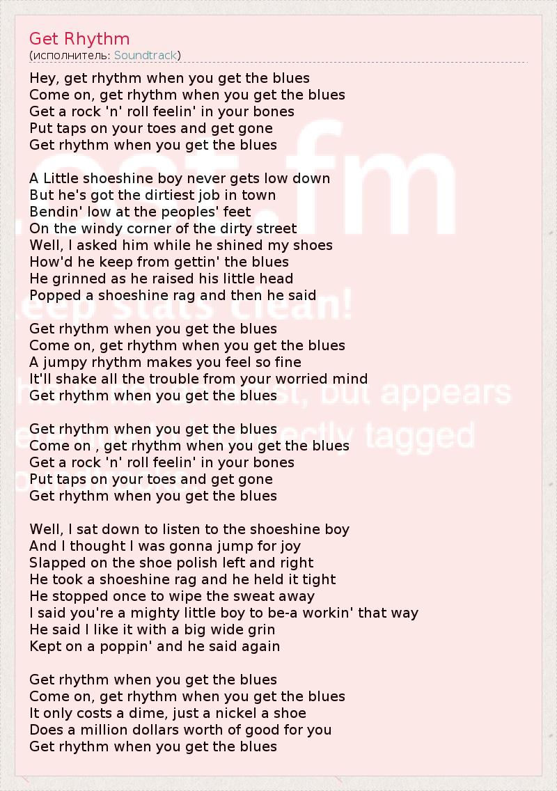 Hey, get rhythm when you get the blues Come on, get rhythm when you get the blues Get a rock 'n' roll feelin' in your bones Put taps on your toes and get gone Get rhythm when you get the blues A Little shoeshine boy never gets low down But he's got the dirtiest job in town Bendin' low at the peoples' feet On the windy corner of the dirty street Well, I asked him while he shined my shoes How'd he keep from gettin' the blues He grinned as he raised his little head Popped a shoeshine rag and then he said Get rhythm when you get the blues Come on, get rhythm when you get the blues A jumpy rhythm makes you feel so fine It'll shake all the trouble from your worried mind Get rhythm when you get the blues Get rhythm when you get the blues Come on , get rhythm when you get the blues Get a rock 'n' roll feelin' in your bones Put taps on your toes and get gone Get rhythm when you get the blues Well, I sat down to listen to the shoeshine boy And I thought I was gonna jump for joy Slapped on the shoe polish left and right He took a shoeshine rag and he held it tight He stopped once to wipe the sweat away I said you're a mighty little boy to be-a workin' that way He said I like it with a big wide grin Kept on a poppin' and he said again Get rhythm when you get the blues Come on, get rhythm when you get the blues It only costs a dime, just a nickel a shoe Does a million dollars worth of good for you Get rhythm when you get the blues