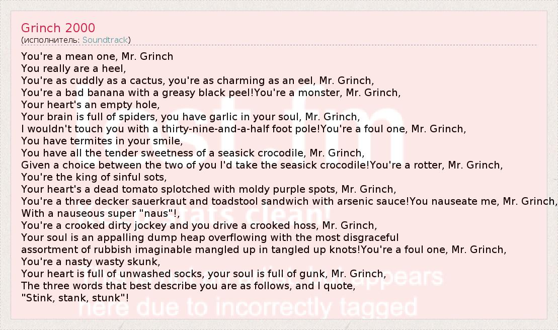 You're a mean one, Mr. Grinch You really are a heel, You're as cuddly as a cactus, you're as charming as an eel, Mr. Grinch, You're a bad banana with a greasy black peel!You're a monster, Mr. Grinch, Your heart's an empty hole, Your brain is full of spiders, you have garlic in your soul, Mr. Grinch, I wouldn't touch you with a thirty-nine-and-a-half foot pole!You're a foul one, Mr. Grinch, You have termites in your smile, You have all the tender sweetness of a seasick crocodile, Mr. Grinch, Given a choice between the two of you I'd take the seasick crocodile!You're a rotter, Mr. Grinch, You're the king of sinful sots, Your heart's a dead tomato splotched with moldy purple spots, Mr. Grinch, You're a three decker sauerkraut and toadstool sandwich with arsenic sauce!You nauseate me, Mr. Grinch, With a nauseous super "naus"!, You're a crooked dirty jockey and you drive a crooked hoss, Mr. Grinch, Your soul is an appalling dump heap overflowing with the most disgraceful assortment of rubbish imaginable mangled up in tangled up knots!You're a foul one, Mr. Grinch, You're a nasty wasty skunk, Your heart is full of unwashed socks, your soul is full of gunk, Mr. Grinch, The three words that best describe you are as follows, and I quote, "Stink, stank, stunk"!