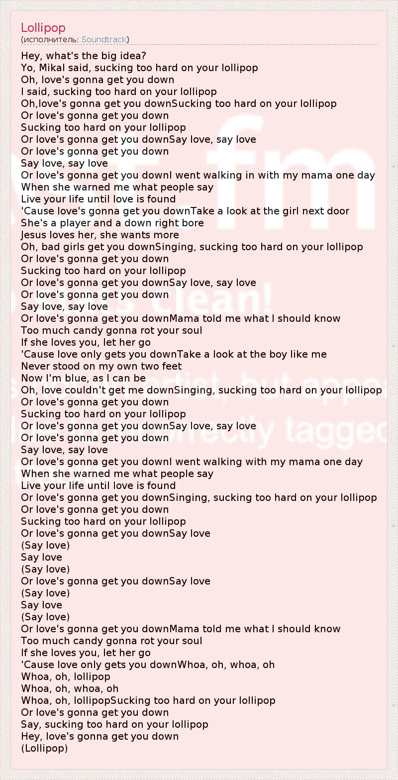 Hey, what's the big idea? Yo, MikaI said, sucking too hard on your lollipop Oh, love's gonna get you down I said, sucking too hard on your lollipop Oh,love's gonna get you downSucking too hard on your lollipop Or love's gonna get you down Sucking too hard on your lollipop Or love's gonna get you downSay love, say love Or love's gonna get you down Say love, say love Or love's gonna get you downI went walking in with my mama one day When she warned me what people say Live your life until love is found 'Cause love's gonna get you downTake a look at the girl next door She's a player and a down right bore Jesus loves her, she wants more Oh, bad girls get you downSinging, sucking too hard on your lollipop Or love's gonna get you down Sucking too hard on your lollipop Or love's gonna get you downSay love, say love Or love's gonna get you down Say love, say love Or love's gonna get you downMama told me what I should know Too much candy gonna rot your soul If she loves you, let her go 'Cause love only gets you downTake a look at the boy like me Never stood on my own two feet Now I'm blue, as I can be Oh, love couldn't get me downSinging, sucking too hard on your lollipop Or love's gonna get you down Sucking too hard on your lollipop Or love's gonna get you downSay love, say love Or love's gonna get you down Say love, say love Or love's gonna get you downI went walking with my mama one day When she warned me what people say Live your life until love is found Or love's gonna get you downSinging, sucking too hard on your lollipop Or love's gonna get you down Sucking too hard on your lollipop Or love's gonna get you downSay love (Say love) Say love (Say love) Or love's gonna get you downSay love (Say love) Say love (Say love) Or love's gonna get you downMama told me what I should know Too much candy gonna rot your soul If she loves you, let her go 'Cause love only gets you downWhoa, oh, whoa, oh Whoa, oh, lollipop Whoa, oh, whoa, oh Whoa, oh, lollipopSucking too hard on your lollipop Or love's gonna get you down Say, sucking too hard on your lollipop Hey, love's gonna get you down (Lollipop)