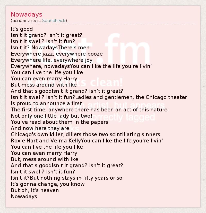 It's good Isn't it grand? Isn't it great? Isn't it swell? Isn't it fun? Isn't it? NowadaysThere's men Everywhere jazz, everywhere booze Everywhere life, everywhere joy Everywhere, nowadaysYou can like the life you're livin' You can live the life you like You can even marry Harry But mess around with Ike And that's goodIsn't it grand? Isn't it great? Isn't it swell? Isn't it fun?Ladies and gentlemen, the Chicago theater Is proud to announce a first The first time, anywhere there has been an act of this nature Not only one little lady but two! You've read about them in the papers And now here they are Chicago's own killer, dillers those two scintillating sinners Roxie Hart and Velma KellyYou can like the life you're livin' You can live the life you like You can even marry Harry But, mess around with Ike And that's goodIsn't it grand? Isn't it great? Isn't it swell? Isn't it fun? Isn't it?But nothing stays in fifty years or so It's gonna change, you know But oh, it's heaven Nowadays