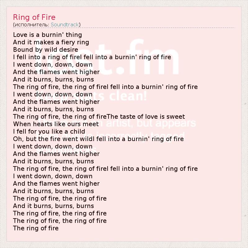 The ring of fire, the ring of fireI fell into a burnin' ring of fire