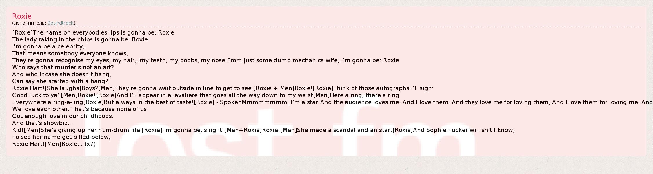[Roxie]The name on everybodies lips is gonna be: Roxie The lady raking in the chips is gonna be: Roxie I'm gonna be a celebrity, That means somebody everyone knows, They're gonna recognise my eyes, my hair,, my teeth, my boobs, my nose.From just some dumb mechanics wife, I'm gonna be: Roxie Who says that murder's not an art? And who incase she doesn't hang, Can say she started with a bang? Roxie Hart![She laughs]Boys?[Men]They're gonna wait outside in line to get to see,[Roxie + Men]Roxie![Roxie]Think of those autographs I'll sign: Good luck to ya'.[Men]Roxie![Roxie]And I'll appear in a lavaliere that goes all the way down to my waist[Men]Here a ring, there a ring Everywhere a ring-a-ling[Roxie]But always in the best of taste![Roxie] - SpokenMmmmmmmm, I'm a star!And the audience loves me. And I love them. And they love me for loving them, And I love them for loving me. And We love each other. That's because none of us Got enough love in our childhoods. And that's showbiz... Kid![Men]She's giving up her hum-drum life.[Roxie]I'm gonna be, sing it![Men+Roxie]Roxie![Men]She made a scandal and an start[Roxie]And Sophie Tucker will shit I know, To see her name get billed below, Roxie Hart![Men]Roxie... (x7)