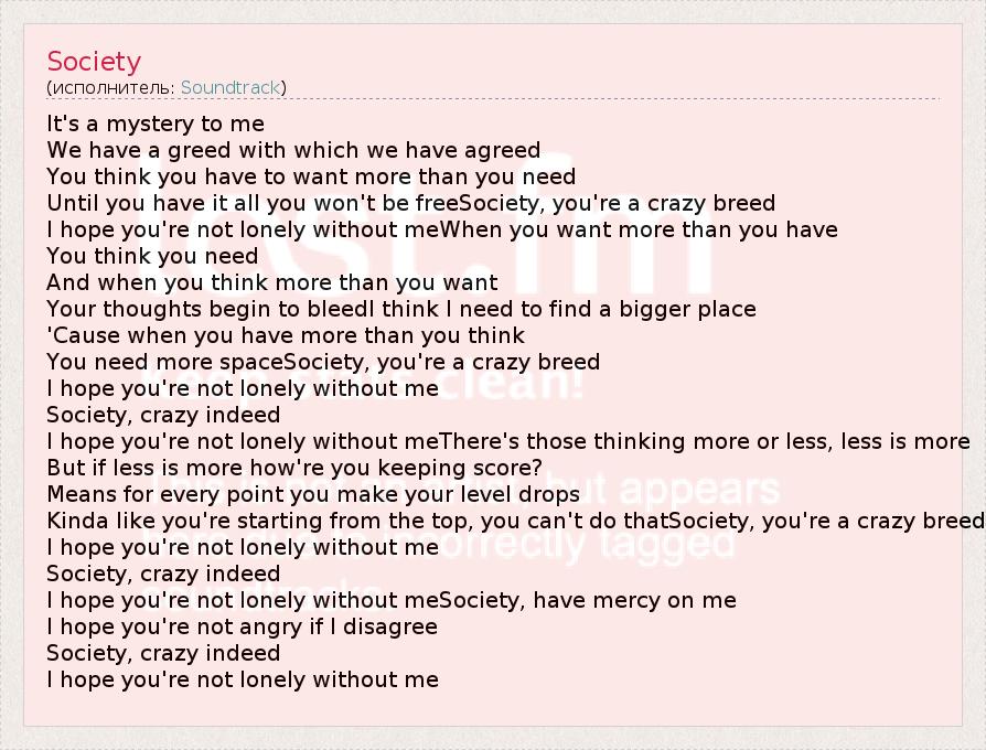 It's a mystery to me We have a greed with which we have agreed You think you have to want more than you need Until you have it all you won't be freeSociety, you're a crazy breed I hope you're not lonely without meWhen you want more than you have You think you need And when you think more than you want Your thoughts begin to bleedI think I need to find a bigger place 'Cause when you have more than you think You need more spaceSociety, you're a crazy breed I hope you're not lonely without me Society, crazy indeed I hope you're not lonely without meThere's those thinking more or less, less is more But if less is more how're you keeping score? Means for every point you make your level drops Kinda like you're starting from the top, you can't do thatSociety, you're a crazy breed I hope you're not lonely without me Society, crazy indeed I hope you're not lonely without meSociety, have mercy on me I hope you're not angry if I disagree Society, crazy indeed I hope you're not lonely without me