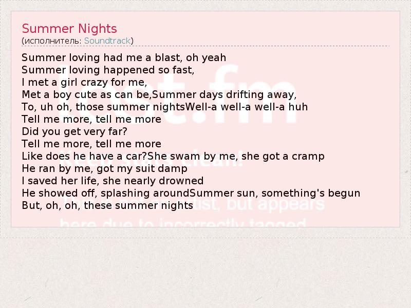А как ты думаешь, о чем песня "Summer Nights" ?