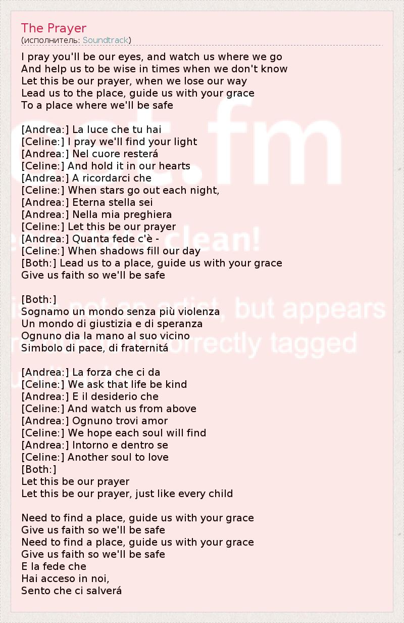 Я молюсь, чтобы Ты стал нашими глазами и наблюдал, куда мы идем, И помог нам быть мудрыми, когда мы не знаем, что делать. Пусть это будет нашей молитвой, когда мы собьёмся с пути. Приведи нас в то место, направь нас милосердно Туда, где мы будем в безопасности. [Andrea:] Свет, которым ты обладаешь... [Celine:] Я молюсь, чтобы мы нашли Твой свет... [Andrea:] Он останется в сердце... [Celine:] И удержали его в своём сердце... [Andrea:] Чтобы напоминать нам о том... [Celine:] Когда звезды появляются каждую ночь... [Andrea:] Что Ты – вечная звезда. [Andrea:] В моей молитве... [Celine:] Пусть это будет нашей молитвой... [Andrea:] Столько веры... [Celine:] Когда грусть наполняет наши дни... [Оба:] Приведи нас в то место, направь нас милосердно Туда, где мы будем в безопасности. [Оба:] Мы мечтаем о мире без насилия, О мире справедливости и надежды. Каждый протянет руку ближнему В знак мира и братства. [Andrea:] Сила, которую даёт нам... [Celine:] Мы просим жизнь быть снисходительнее... [Andrea:] И желание, чтобы... [Celine:] И наблюдать за нами сверху... [Andrea:] Каждый нашёл любовь... [Celine:] Мы надеемся, что каждая душа... [Andrea:] Вокруг и внутри себя... [Celine:] Найдет другую душу, чтобы любить её... [Оба:] Пусть это будет нашей молитвой, Пусть это будет нашей молитвой. Как любому ребёнку, Нам надо найти такое место... Направь нас милосердно, Подари нам веру - и мы будем в безопасности. Надо найти такое место... Направь нас милосердно, Подари нам веру - и мы будем в безопасности. И та вера, которую Ты разжег в нас, Я чувствую, что она нас спасёт...