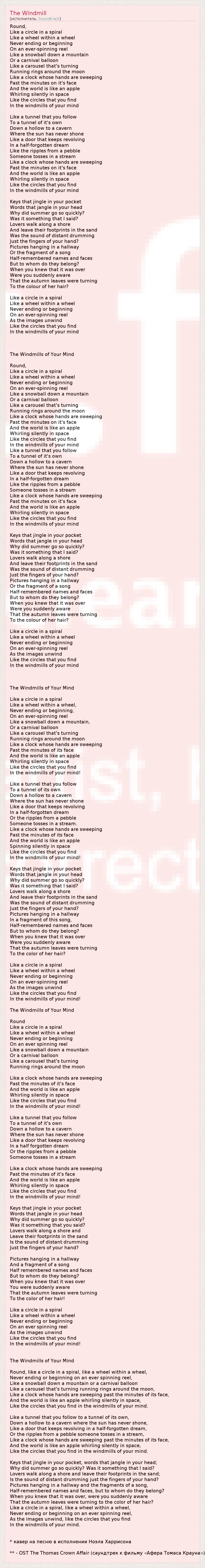 Оборот, Еще один виток спирали, Еще один поворот колеса, Бесконечно, непрестанно Раскручивающаяся катушка, Снежный ком, несущийся с горы Или воздушный шар на празднике, Карусель, которая кружится День и ночь вокруг Луны, Стрелки часов, которые сметают с лица земли прошлое, Минуту за минутой – Все это наш мир, который вертится, Словно яблоко, подброшенное вверх, Также как вертятся крылья Мельниц твоей души. Туннель, по которому ты идешь, Чтобы прийти в то же место, из которого вышел, Дорога, ведущая вниз, в пещеру, Где никогда не видно солнечного света, Дверь, открыв которую, Попадаешь в полузабытый сон, Рябь на воде От нескольких брошенных камешков, Стрелки часов, которые сметают с лица земли прошлое, Минуту за минутой – Все это наш мир, который вертится, Словно яблоко, подброшенное вверх, Также как вертятся крылья Мельниц твоей души. Ключи, звенящие в твоем кармане, Слова, гремящие в твоих ушах: «Почему так быстро закончилось лето?» - Неужели ты сам произнес их? Влюбленные гуляющие по берегу моря, Чьи следы еще видны на песке. Неужели этот барабанный бой – Всего лишь стук твоих пальцев по столу? Картины, висящие в холле, Обрывки песен, Полузабытые имена и лица – Откуда все это? Когда ты понял, что все кончено, Не заметил ли ты, Что даже осенние листья Напоминают тебе цвет ее волос. Еще один виток спирали, Еще один поворот колеса, Бесконечно, непрестанно Раскручивающаяся катушка, Цепь бесконечно разворачивающихся видений – Все это не более чем обороты крыльев Мельниц твоей души В ветряках своего разума (перевод Angler) По кругу, как виток спирали, как два кольца одного подшипника, не имеющие ни начала ни конца на крутящейся вечно бобине. Как катящийся с горы снежный ком или как воздушный шарик на карнавале. Как карусель, что вращается, описывая круги около луны. Как часы, стрелки которых сметают минуты с циферблата. И мир, как яблоко, вращающееся в космосе. Как круги, что ты находишь в ветряках своего разума. Как тоннель, который приводит тебя в другой тоннель, вниз по впадине, ведущей в пещеру, куда никогда не заглядывает солнце. Как турникет, что непрерывно вращается в полузабытом сне. Как круги от гальки, брошенной кем-то в воду. Как часы, стрелки которых сметают минуты с циферблата. И мир, как яблоко, вращающееся в космосе. Как круги, что ты находишь в ветряках своего разума. Ключи, брякающие в твоем кармане, Вопросы, звучащие у тебя в голове: Почему так быстро прошло лето? Неужели я это сказал? Влюбленные прогуливаются по побережью и оставляют следы на песке. Неужели отзвук барабанов - это всего лишь стук твоих пальцев? Картины, висящие в коридоре, фрагмент из песни, полузабытые имена и лица, - кому они принадлежат. Когда ты узнал, что всему пришел конец? Неужели ты внезапно осознал, что осенние листья обретают цвет ее волос? Как виток спирали, как два кольца одного подшипника без начала и конца, как вечно крутящаяся бобина, как раскручивающиеся образы. Как круги, что ты находишь в ветряках своего разума. Ветряки внутри сознанья (перевод Александр из Санкт-Петербурга) Словно круг внутри спирали, Словно втулка в колесе, Без конца и без начала, Вместе вертимся мы все, Словно снежный ком с вершины, Как большой воздушный шар, Карусель, что вечно мчится Вкруг луны под звон гитар, Словно стрелки в циферблате, Чьи движенья так точны, Мир, как яблоко, парящий Среди з
