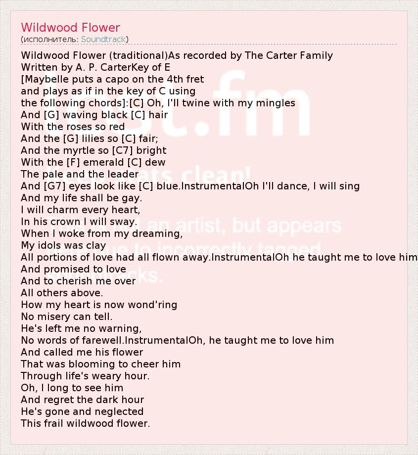 Wildwood Flower (traditional)As recorded by The Carter Family Written by A. P. CarterKey of E [Maybelle puts a capo on the 4th fret and plays as if in the key of C using the following chords]:[C] Oh, I'll twine with my mingles And [G] waving black [C] hair With the roses so red And the [G] lilies so [C] fair; And the myrtle so [C7] bright With the [F] emerald [C] dew The pale and the leader And [G7] eyes look like [C] blue.InstrumentalOh I'll dance, I will sing And my life shall be gay. I will charm every heart, In his crown I will sway. When I woke from my dreaming, My idols was clay All portions of love had all flown away.InstrumentalOh he taught me to love him And promised to love And to cherish me over All others above. How my heart is now wond'ring No misery can tell. He's left me no warning, No words of farewell.InstrumentalOh, he taught me to love him And called me his flower That was blooming to cheer him Through life's weary hour. Oh, I long to see him And regret the dark hour He's gone and neglected This frail wildwood flower.