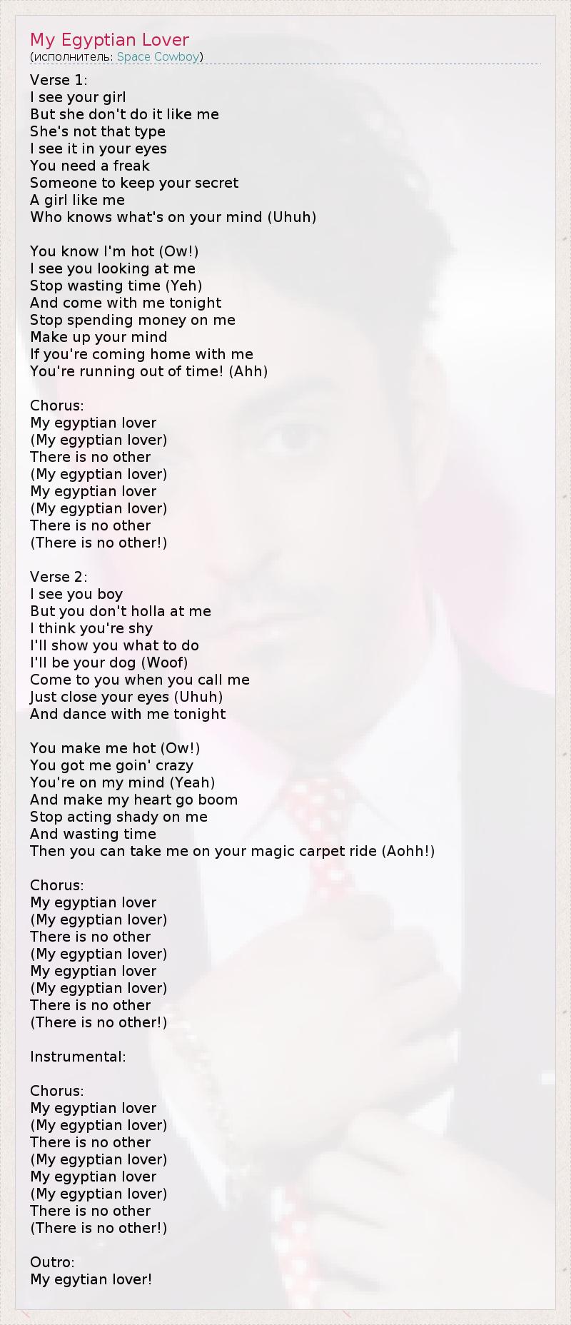 1-ый куплет: Я вижу твою подружку. Но она делает это не так, Она не из раскованных. По твоим глазам я вижу, Что тебе нужен фрик, Кто-то, кто будет хранить твои секреты, Такая девушка, как я, Которая знает, чего ты хочешь (ага!). Знаешь, я такая страстная... (оу!) Я знаю, ты смотришь на меня, Не замечая, что время идет (да!). Этой ночью ты уйдешь со мной. Можешь не тратить на меня деньги - Решайся, Пойдёшь ли ты домой со мной, Разве ты не видишь - время уходит! (а-а-а!) Припев: Мой любимый египтянин (Мой любимый египтянин) Другого мне не надо (Мой любимый египтянин) Мой любимый египтянин (Мой любимый египтянин) Другого мне не надо (Другого мне не надо) 2-ой куплет: Я вижу тебя, парень, Но ты не слышишь, как я зову тебя. Думаю, ты просто стесняешься. Я покажу тебе, что нужно делать, Буду твоей с*чкой (у-у-у!). Приду, когда ты позовешь. Просто закрой глаза И танцуй со мной всю ночь! Ты меня заводишь, (оу!) Сводишь меня с ума. Я думаю только о тебе, (да!) Ты заставляешь моё сердце бешено стучать. Хватит надо мной издеваться И попусту тратить время, Ведь ты можешь прокатить меня на своем ковре-самолете. Припев: Мой любимый египтянин (Мой любимый египтянин) Другого мне не надо (Мой любимый египтянин) Мой любимый египтянин (Мой любимый египтянин) Другого мне не надо (Другого мне не надо) Проигрыш: Припев: Мой любимый египтянин (Мой любимый египтянин) Другого мне не надо (Мой любимый египтянин) Мой любимый египтянин (Мой любимый египтянин) Другого мне не надо (Другого мне не надо) Переход: Мой любимый египтянин!