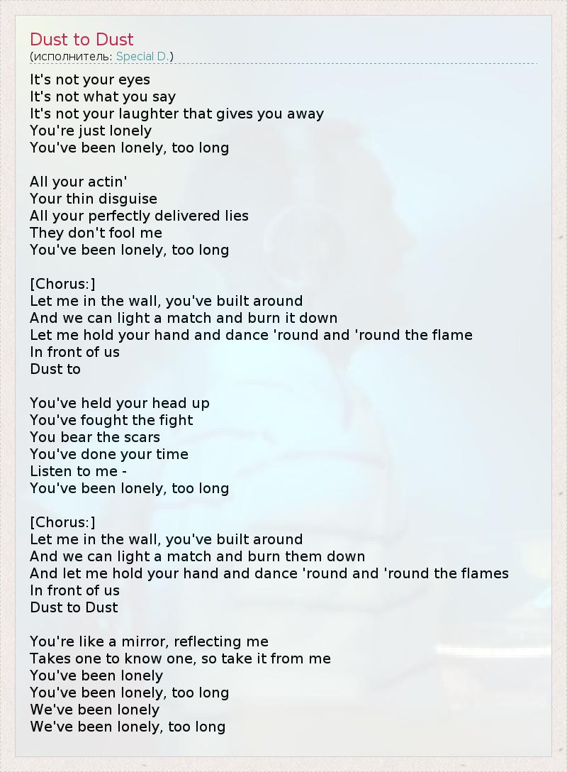 It's not your eyes It's not what you say It's not your laughter that gives you away You're just lonely You've been lonely, too long All your actin' Your thin disguise All your perfectly delivered lies They don't fool me You've been lonely, too long [Chorus:] Let me in the wall, you've built around And we can light a match and burn it down Let me hold your hand and dance 'round and 'round the flame In front of us Dust to You've held your head up You've fought the fight You bear the scars You've done your time Listen to me - You've been lonely, too long [Chorus:] Let me in the wall, you've built around And we can light a match and burn them down And let me hold your hand and dance 'round and 'round the flames In front of us Dust to Dust You're like a mirror, reflecting me Takes one to know one, so take it from me You've been lonely You've been lonely, too long We've been lonely We've been lonely, too long