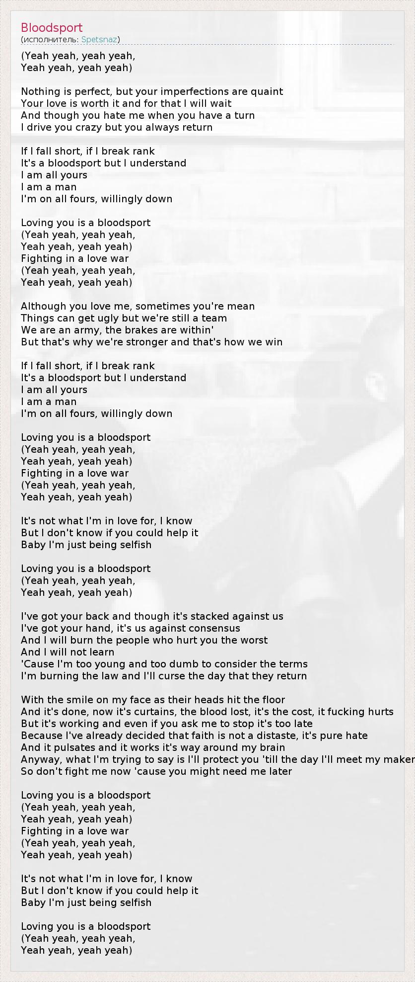 (Yeah yeah, yeah yeah, Yeah yeah, yeah yeah) Nothing is perfect, but your imperfections are quaint Your love is worth it and for that I will wait And though you hate me when you have a turn I drive you crazy but you always return If I fall short, if I break rank It's a bloodsport but I understand I am all yours I am a man I'm on all fours, willingly down Loving you is a bloodsport (Yeah yeah, yeah yeah, Yeah yeah, yeah yeah) Fighting in a love war (Yeah yeah, yeah yeah, Yeah yeah, yeah yeah) Although you love me, sometimes you're mean Things can get ugly but we're still a team We are an army, the brakes are within' But that's why we're stronger and that's how we win If I fall short, if I break rank It's a bloodsport but I understand I am all yours I am a man I'm on all fours, willingly down Loving you is a bloodsport (Yeah yeah, yeah yeah, Yeah yeah, yeah yeah) Fighting in a love war (Yeah yeah, yeah yeah, Yeah yeah, yeah yeah) It's not what I'm in love for, I know But I don't know if you could help it Baby I'm just being selfish Loving you is a bloodsport (Yeah yeah, yeah yeah, Yeah yeah, yeah yeah) I've got your back and though it's stacked against us I've got your hand, it's us against consensus And I will burn the people who hurt you the worst And I will not learn 'Cause I'm too young and too dumb to consider the terms I'm burning the law and I'll curse the day that they return With the smile on my face as their heads hit the floor And it's done, now it's curtains, the blood lost, it's the cost, it fucking hurts But it's working and even if you ask me to stop it's too late Because I've already decided that faith is not a distaste, it's pure hate And it pulsates and it works it's way around my brain Anyway, what I'm trying to say is I'll protect you 'till the day I'll meet my maker So don't fight me now 'cause you might need me later Loving you is a bloodsport (Yeah yeah, yeah yeah, Yeah yeah, yeah yeah) Fighting in a love war (Yeah yeah, yeah yeah, Yeah yeah, yeah yeah) It's not what I'm in love for, I know But I don't know if you could help it Baby I'm just being selfish Loving you is a bloodsport (Yeah yeah, yeah yeah, Yeah yeah, yeah yeah)