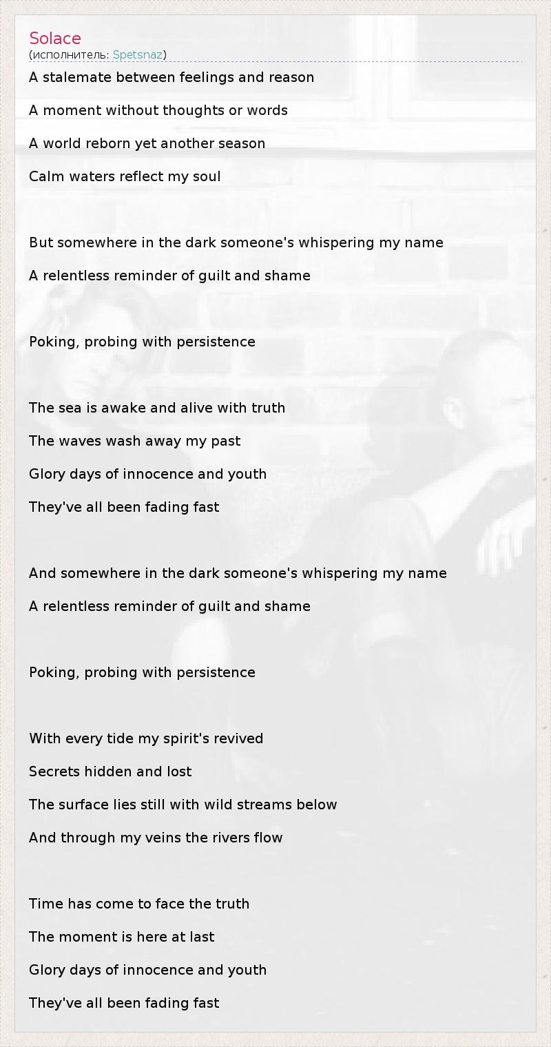 A stalemate between feelings and reason A moment without thoughts or words A world reborn yet another season Calm waters reflect my soul But somewhere in the dark someone's whispering my name A relentless reminder of guilt and shame Poking, probing with persistence The sea is awake and alive with truth The waves wash away my past Glory days of innocence and youth They've all been fading fast And somewhere in the dark someone's whispering my name A relentless reminder of guilt and shame Poking, probing with persistence With every tide my spirit's revived Secrets hidden and lost The surface lies still with wild streams below And through my veins the rivers flow Time has come to face the truth The moment is here at last Glory days of innocence and youth They've all been fading fast