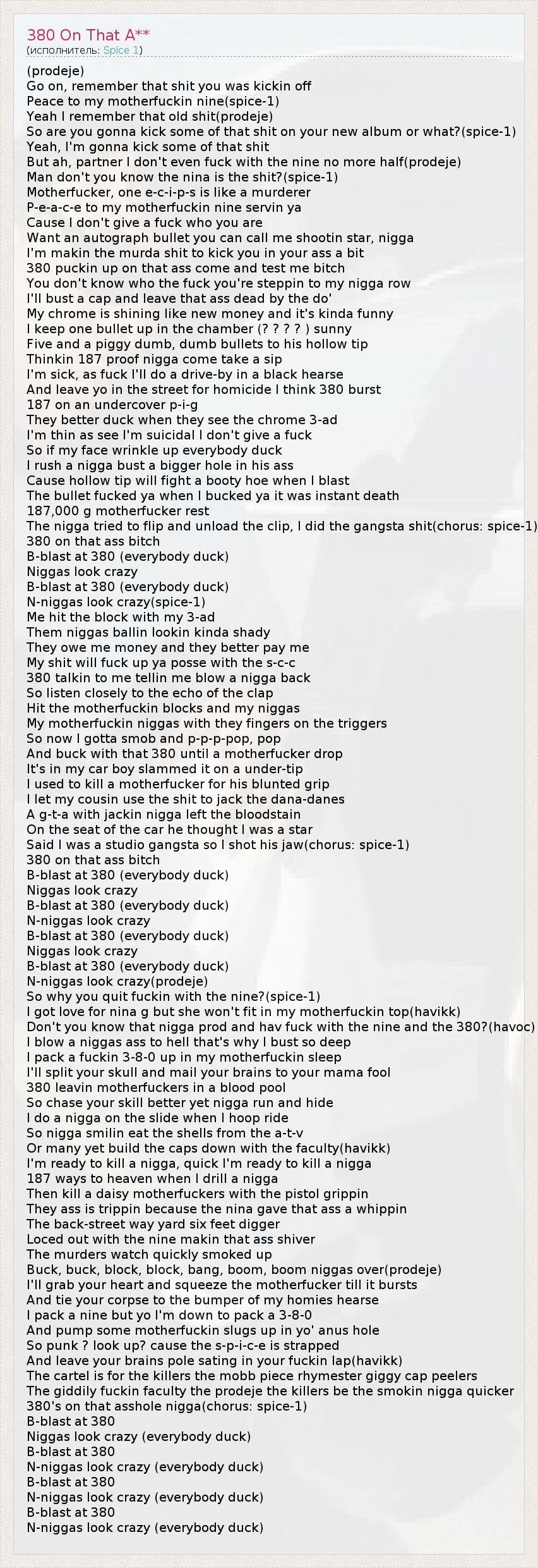 (prodeje) Go on, remember that shit you was kickin off Peace to my motherfuckin nine(spice-1) Yeah I remember that old shit(prodeje) So are you gonna kick some of that shit on your new album or what?(spice-1) Yeah, I'm gonna kick some of that shit But ah, partner I don't even fuck with the nine no more half(prodeje) Man don't you know the nina is the shit?(spice-1) Motherfucker, one e-c-i-p-s is like a murderer P-e-a-c-e to my motherfuckin nine servin ya Cause I don't give a fuck who you are Want an autograph bullet you can call me shootin star, nigga I'm makin the murda shit to kick you in your ass a bit 380 puckin up on that ass come and test me bitch You don't know who the fuck you're steppin to my nigga row I'll bust a cap and leave that ass dead by the do' My chrome is shining like new money and it's kinda funny I keep one bullet up in the chamber (? ? ? ? ) sunny Five and a piggy dumb, dumb bullets to his hollow tip Thinkin 187 proof nigga come take a sip I'm sick, as fuck I'll do a drive-by in a black hearse And leave yo in the street for homicide I think 380 burst 187 on an undercover p-i-g They better duck when they see the chrome 3-ad I'm thin as see I'm suicidal I don't give a fuck So if my face wrinkle up everybody duck I rush a nigga bust a bigger hole in his ass Cause hollow tip will fight a booty hoe when I blast The bullet fucked ya when I bucked ya it was instant death 187,000 g motherfucker rest The nigga tried to flip and unload the clip, I did the gangsta shit(chorus: spice-1) 380 on that ass bitch B-blast at 380 (everybody duck) Niggas look crazy B-blast at 380 (everybody duck) N-niggas look crazy(spice-1) Me hit the block with my 3-ad Them niggas ballin lookin kinda shady They owe me money and they better pay me My shit will fuck up ya posse with the s-c-c 380 talkin to me tellin me blow a nigga back So listen closely to the echo of the clap Hit the motherfuckin blocks and my niggas My motherfuckin niggas with they fingers on the triggers So now I gotta smob and p-p-p-pop, pop And buck with that 380 until a motherfucker drop It's in my car boy slammed it on a under-tip I used to kill a motherfucker for his blunted grip I let my cousin use the shit to jack the dana-danes A g-t-a with jackin nigga left the bloodstain On the seat of the car he thought I was a star Said I was a studio gangsta so I shot his jaw(chorus: spice-1) 380 on that ass bitch B-blast at 380 (everybody duck) Niggas look crazy B-blast at 380 (everybody duck) N-niggas look crazy B-blast at 380 (everybody duck) Niggas look crazy B-blast at 380 (everybody duck) N-niggas look crazy(prodeje) So why you quit fuckin with the nine?(spice-1) I got love for nina g but she won't fit in my motherfuckin top(havikk) Don't you know that nigga prod and hav fuck with the nine and the 380?(havoc) I blow a niggas ass to hell that's why I bust so deep I pack a fuckin 3-8-0 up in my motherfuckin sleep I'll split your skull and mail your brains to your mama fool 380 leavin motherfuckers in a blood pool So chase your skill better yet nigga run and hide I do a nigga on the slide when I hoop ride So nigga smilin eat the shells from the a-t-v Or many yet build the caps down with the faculty(havikk) I'm ready to kill a nigga, quick I'm ready to kill a nigga 187 ways to heaven when I drill a nigga Then kill a daisy motherfuckers with the pistol grippin They ass is trippin because the nina gave that ass a whippin The back-street way yard six feet digger Loced out with the nine makin that ass shiver The murders watch quickly smoked up Buck, buck, block, block, bang, boom, boom niggas over(prodeje) I'll grab your heart and squeeze the motherfucker till it bursts And tie your corpse to the bumper of my homies hearse I pack a nine but yo I'm down to pack a 3-8-0 And pump some motherfuckin slugs up in yo' anus hole So punk ? look up? cause the s-p-i-c-e is strapped And leave your brains pole sating in your fuckin lap(havikk) The cartel is for the killers the mobb piece rhymester giggy cap peelers The giddily fuckin faculty the prodeje the killers be the smokin nigga quicker 380's on that asshole nigga(chorus: spice-1) B-blast at 380 Niggas look crazy (everybody duck) B-blast at 380 N-niggas look crazy (everybody duck) B-blast at 380 N-niggas look crazy (everybody duck) B-blast at 380 N-niggas look crazy (everybody duck)
