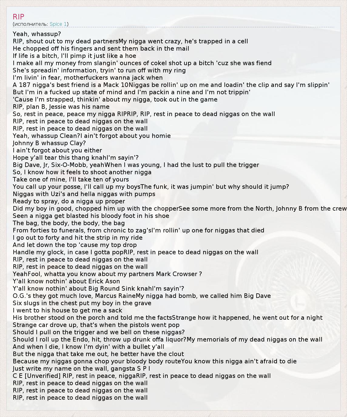 C E [Unverified] RIP, rest in peace, niggaRIP, rest in peace to dead niggas on the wall