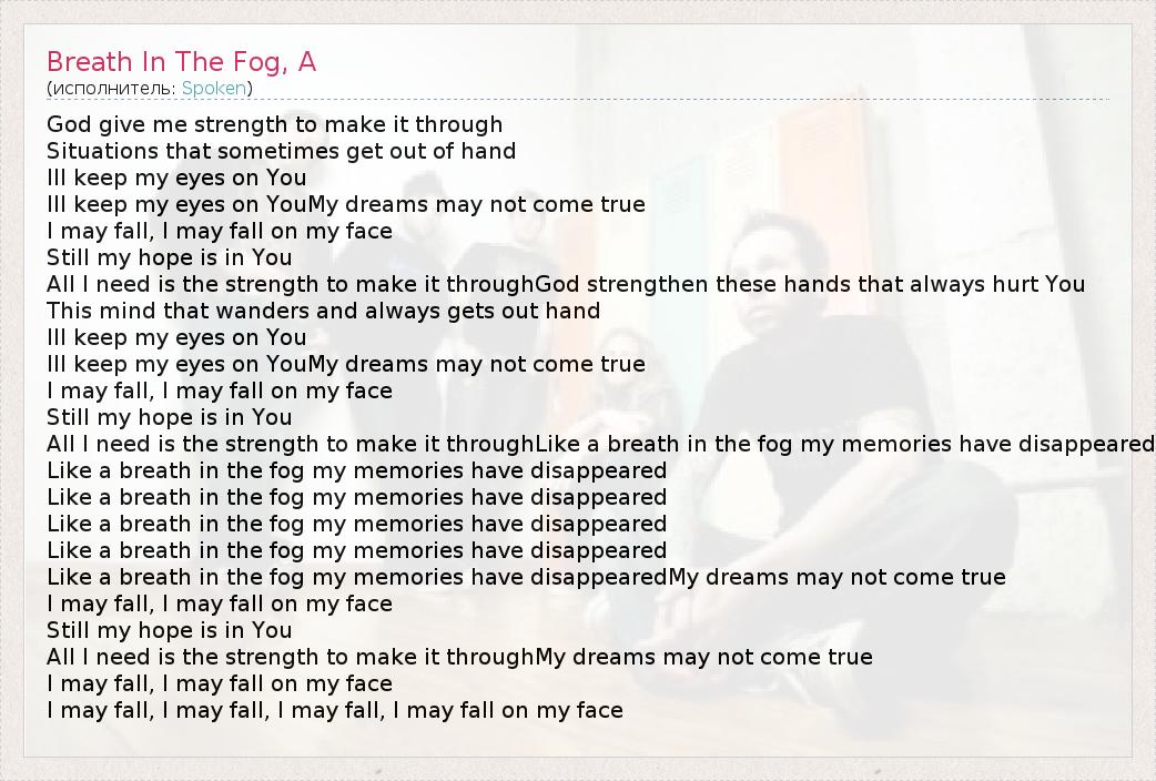 God give me strength to make it through Situations that sometimes get out of hand Ill keep my eyes on You Ill keep my eyes on YouMy dreams may not come true I may fall, I may fall on my face Still my hope is in You All I need is the strength to make it throughGod strengthen these hands that always hurt You This mind that wanders and always gets out hand Ill keep my eyes on You Ill keep my eyes on YouMy dreams may not come true I may fall, I may fall on my face Still my hope is in You All I need is the strength to make it throughLike a breath in the fog my memories have disappeared Like a breath in the fog my memories have disappeared Like a breath in the fog my memories have disappeared Like a breath in the fog my memories have disappeared Like a breath in the fog my memories have disappeared Like a breath in the fog my memories have disappearedMy dreams may not come true I may fall, I may fall on my face Still my hope is in You All I need is the strength to make it throughMy dreams may not come true I may fall, I may fall on my face I may fall, I may fall, I may fall, I may fall on my face