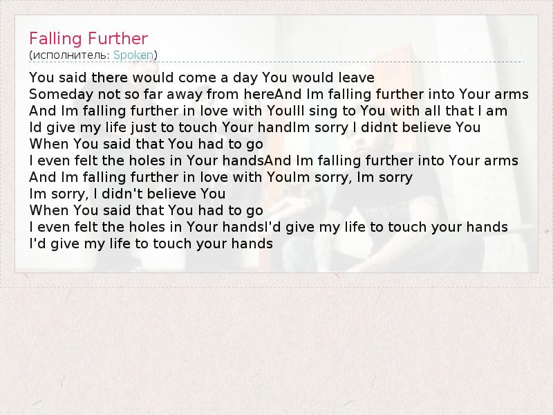 I even felt the holes in Your handsAnd Im falling further into Your arms