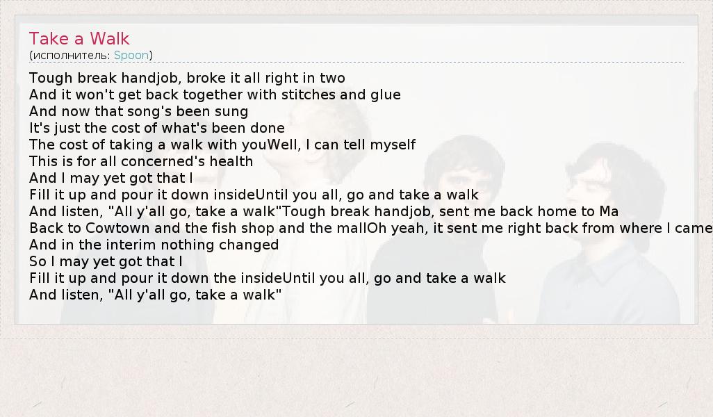 А как ты думаешь, о чем песня "Take a Walk" ?
