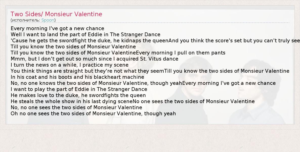 А как ты думаешь, о чем песня "Two Sides/ Monsieur Valentine" ?