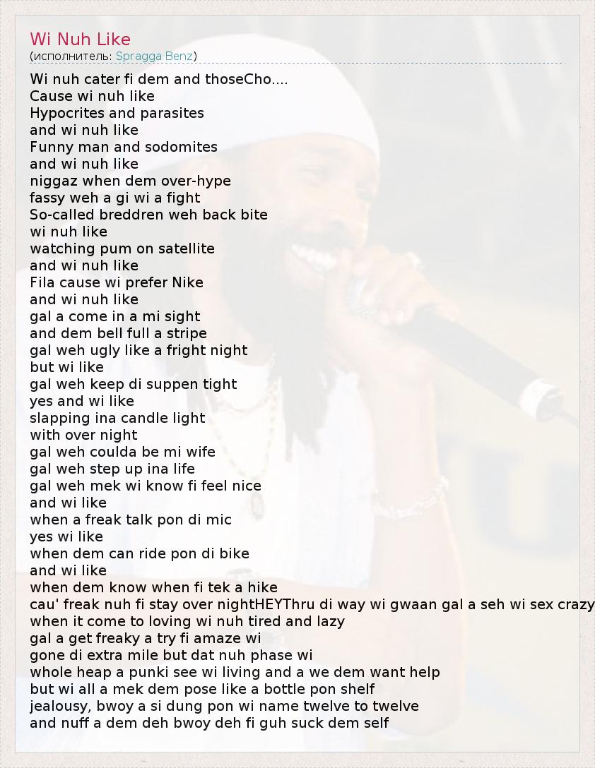 Wi nuh cater fi dem and thoseCho.... Cause wi nuh like Hypocrites and parasites and wi nuh like Funny man and sodomites and wi nuh like niggaz when dem over-hype fassy weh a gi wi a fight So-called breddren weh back bite wi nuh like watching pum on satellite and wi nuh like Fila cause wi prefer Nike and wi nuh like gal a come in a mi sight and dem bell full a stripe gal weh ugly like a fright night but wi like gal weh keep di suppen tight yes and wi like slapping ina candle light with over night gal weh coulda be mi wife gal weh step up ina life gal weh mek wi know fi feel nice and wi like when a freak talk pon di mic yes wi like when dem can ride pon di bike and wi like when dem know when fi tek a hike cau' freak nuh fi stay over nightHEYThru di way wi gwaan gal a seh wi sex crazy when it come to loving wi nuh tired and lazy gal a get freaky a try fi amaze wi gone di extra mile but dat nuh phase wi whole heap a punki see wi living and a we dem want help but wi all a mek dem pose like a bottle pon shelf jealousy, bwoy a si dung pon wi name twelve to twelve and nuff a dem deh bwoy deh fi guh suck dem self