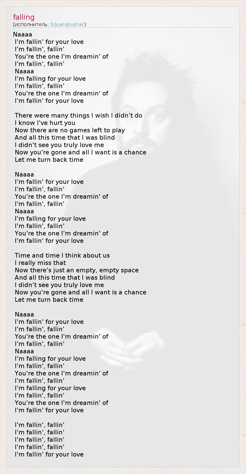 Влюбляюсь Сейчас я влюбляюсь в твою любовь Я влюбляюсь, влюбляюсь Ты – тот, о ком я мечтала Я влюбляюсь, влюбляюсь Сейчас я влюбляюсь в твою любовь Я влюбляюсь, влюбляюсь Ты – тот, о ком я мечтала Я влюбляюсь, влюбляюсь Есть много вещей, которые я хотела бы не делать Я знаю, это ранит тебя Но теперь нам незачем играть в игры Всё это время я не видела Как сильно ты любил меня Теперь ты ушел, всё, что мне нужно, – это шанс Позволь мне вернуть назад время Сейчас я влюбляюсь в твою любовь Я влюбляюсь, влюбляюсь Ты – тот, о ком я мечтала Я влюбляюсь, влюбляюсь Сейчас я влюбляюсь в твою любовь Я влюбляюсь, влюбляюсь Ты – тот, о ком я мечтала Я влюбляюсь, влюбляюсь Снова и снова я думаю о нас с тобой Я действительно скучаю Осталось лишь пустое место в сердце Всё это время я не видела Как сильно ты любил меня Теперь ты ушел, всё, что мне нужно, – это шанс Позволь мне вернуть назад время Сейчас я влюбляюсь в твою любовь Я влюбляюсь, влюбляюсь Ты – тот, о ком я мечтала Я влюбляюсь, влюбляюсь Сейчас я влюбляюсь в твою любовь Я влюбляюсь, влюбляюсь Ты – тот, о ком я мечтала Я влюбляюсь, влюбляюсь