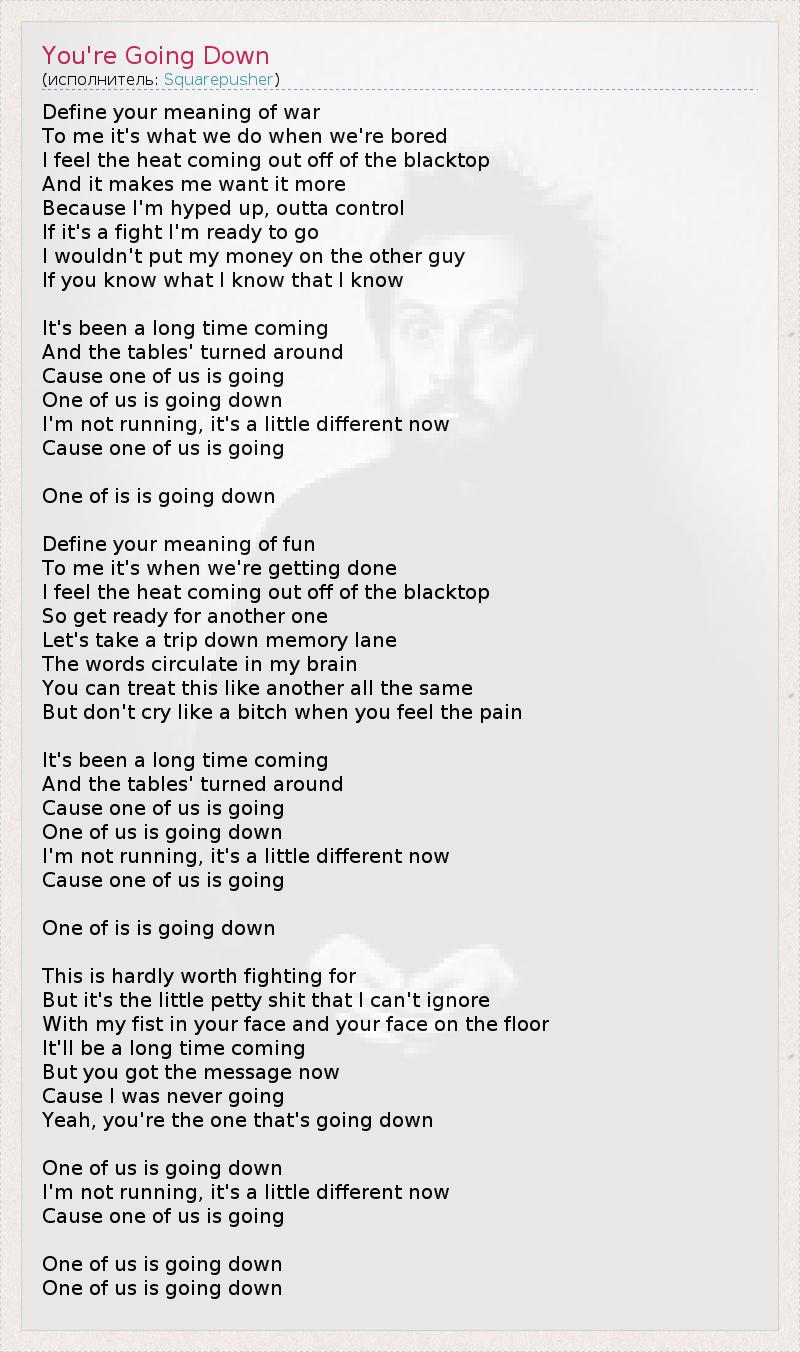Define your meaning of war To me it's what we do when we're bored I feel the heat coming out off of the blacktop And it makes me want it more Because I'm hyped up, outta control If it's a fight I'm ready to go I wouldn't put my money on the other guy If you know what I know that I know It's been a long time coming And the tables' turned around Cause one of us is going One of us is going down I'm not running, it's a little different now Cause one of us is going One of is is going down Define your meaning of fun To me it's when we're getting done I feel the heat coming out off of the blacktop So get ready for another one Let's take a trip down memory lane The words circulate in my brain You can treat this like another all the same But don't cry like a bitch when you feel the pain It's been a long time coming And the tables' turned around Cause one of us is going One of us is going down I'm not running, it's a little different now Cause one of us is going One of is is going down This is hardly worth fighting for But it's the little petty shit that I can't ignore With my fist in your face and your face on the floor It'll be a long time coming But you got the message now Cause I was never going Yeah, you're the one that's going down One of us is going down I'm not running, it's a little different now Cause one of us is going One of us is going down One of us is going down