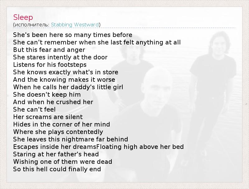 She's been here so many times before She can't remember when she last felt anything at all But this fear and anger She stares intently at the door Listens for his footsteps She knows exactly what's in store And the knowing makes it worse When he calls her daddy's little girl She doesn't keep him And when he crushed her She can't feel Her screams are silent Hides in the corner of her mind Where she plays contentedly She leaves this nightmare far behind Escapes inside her dreamsFloating high above her bed Staring at her father's head Wishing one of them were dead So this hell could finally end