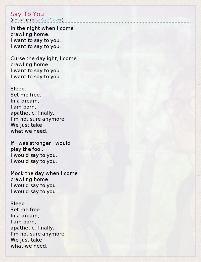 In the night when I come crawling home. I want to say to you. I want to say to you. Curse the daylight, I come crawling home. I want to say to you. I want to say to you. Sleep. Set me free. In a dream, I am born, apathetic, finally. I'm not sure anymore. We just take what we need. If I was stronger I would play the fool. I would say to you. I would say to you. Mock the day when I come crawling home. I would say to you. I would say to you. Sleep. Set me free. In a dream, I am born, apathetic, finally. I'm not sure anymore. We just take what we need.