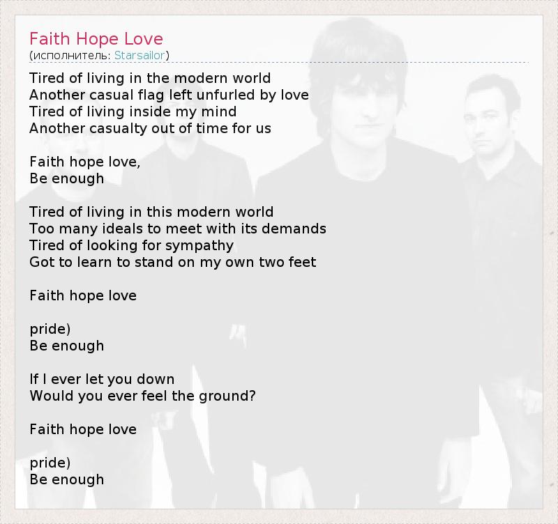 Tired of living in the modern world Another casual flag left unfurled by love Tired of living inside my mind Another casualty out of time for us Faith hope love, Be enough Tired of living in this modern world Too many ideals to meet with its demands Tired of looking for sympathy Got to learn to stand on my own two feet Faith hope love pride) Be enough If I ever let you down Would you ever feel the ground? Faith hope love pride) Be enough