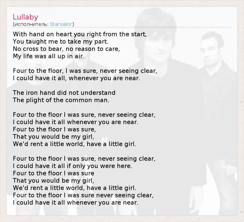 Это интересно:Starsailor (в переводе с англ. — «Звёздный странник») — английская рок-группа, основанная в Уиган, графство Большой Манчестер, Англия. На 2009-й год группа выпустила четыре студийных альбома. Двенадцать из тринадцати синглов попали в официальный хит-парад синглов Великобритании, также группа продала около 3 млн. копий своих записей. В ноябре 2009 года группа объявила о бессрочном отпуске, одновременно... продолжение