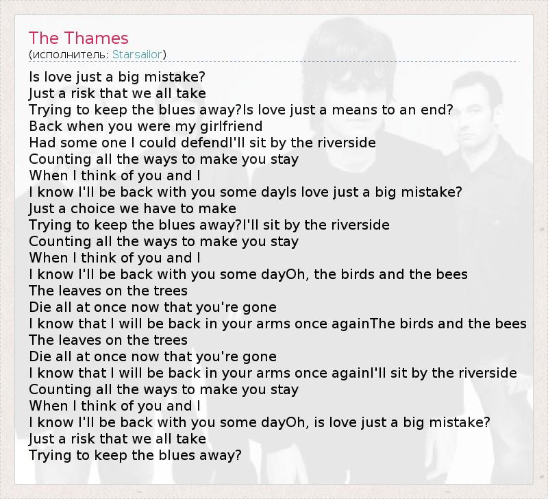 Is love just a big mistake? Just a risk that we all take Trying to keep the blues away?Is love just a means to an end? Back when you were my girlfriend Had some one I could defendI'll sit by the riverside Counting all the ways to make you stay When I think of you and I I know I'll be back with you some dayIs love just a big mistake? Just a choice we have to make Trying to keep the blues away?I'll sit by the riverside Counting all the ways to make you stay When I think of you and I I know I'll be back with you some dayOh, the birds and the bees The leaves on the trees Die all at once now that you're gone I know that I will be back in your arms once againThe birds and the bees The leaves on the trees Die all at once now that you're gone I know that I will be back in your arms once againI'll sit by the riverside Counting all the ways to make you stay When I think of you and I I know I'll be back with you some dayOh, is love just a big mistake? Just a risk that we all take Trying to keep the blues away?