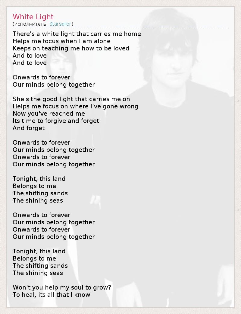 There's a white light that carries me home Helps me focus when I am alone Keeps on teaching me how to be loved And to love And to love Onwards to forever Our minds belong together She's the good light that carries me on Helps me focus on where I've gone wrong Now you've reached me Its time to forgive and forget And forget Onwards to forever Our minds belong together Onwards to forever Our minds belong together Tonight, this land Belongs to me The shifting sands The shining seas Onwards to forever Our minds belong together Onwards to forever Our minds belong together Tonight, this land Belongs to me The shifting sands The shining seas Won't you help my soul to grow? To heal, its all that I know
