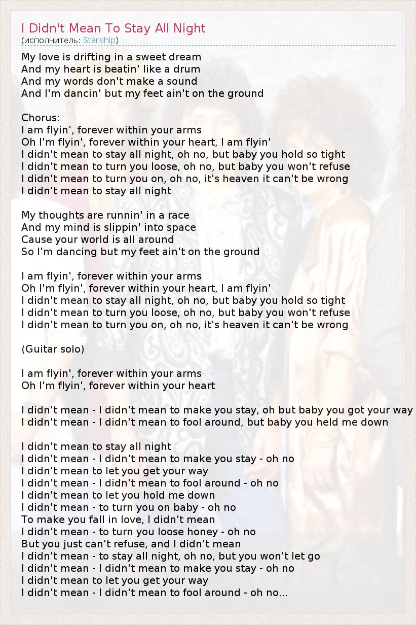 My love is drifting in a sweet dream And my heart is beatin' like a drum And my words don't make a sound And I'm dancin' but my feet ain't on the ground Chorus: I am flyin', forever within your arms Oh I'm flyin', forever within your heart, I am flyin' I didn't mean to stay all night, oh no, but baby you hold so tight I didn't mean to turn you loose, oh no, but baby you won't refuse I didn't mean to turn you on, oh no, it's heaven it can't be wrong I didn't mean to stay all night My thoughts are runnin' in a race And my mind is slippin' into space Cause your world is all around So I'm dancing but my feet ain't on the ground I am flyin', forever within your arms Oh I'm flyin', forever within your heart, I am flyin' I didn't mean to stay all night, oh no, but baby you hold so tight I didn't mean to turn you loose, oh no, but baby you won't refuse I didn't mean to turn you on, oh no, it's heaven it can't be wrong (Guitar solo) I am flyin', forever within your arms Oh I'm flyin', forever within your heart I didn't mean - I didn't mean to make you stay, oh but baby you got your way I didn't mean - I didn't mean to fool around, but baby you held me down I didn't mean to stay all night I didn't mean - I didn't mean to make you stay - oh no I didn't mean to let you get your way I didn't mean - I didn't mean to fool around - oh no I didn't mean to let you hold me down I didn't mean - to turn you on baby - oh no To make you fall in love, I didn't mean I didn't mean - to turn you loose honey - oh no But you just can't refuse, and I didn't mean I didn't mean - to stay all night, oh no, but you won't let go I didn't mean - I didn't mean to make you stay - oh no I didn't mean to let you get your way I didn't mean - I didn't mean to fool around - oh no...