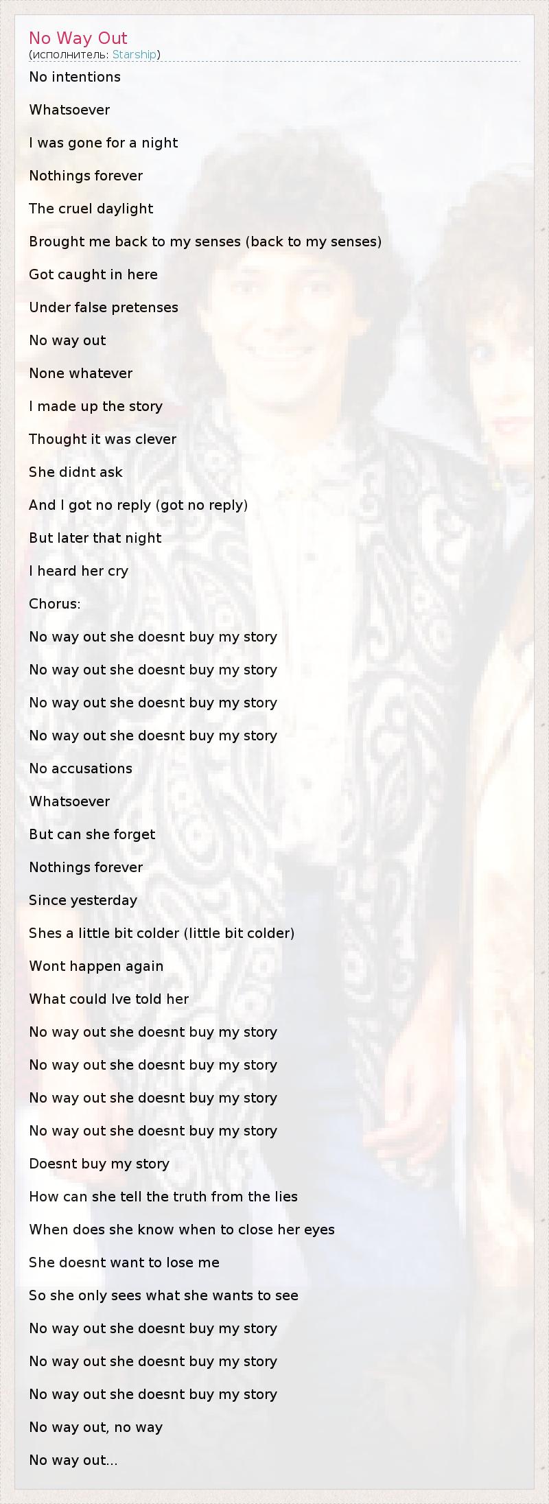 No intentions Whatsoever I was gone for a night Nothings forever The cruel daylight Brought me back to my senses (back to my senses) Got caught in here Under false pretenses No way out None whatever I made up the story Thought it was clever She didnt ask And I got no reply (got no reply) But later that night I heard her cry Chorus: No way out she doesnt buy my story No way out she doesnt buy my story No way out she doesnt buy my story No way out she doesnt buy my story No accusations Whatsoever But can she forget Nothings forever Since yesterday Shes a little bit colder (little bit colder) Wont happen again What could Ive told her No way out she doesnt buy my story No way out she doesnt buy my story No way out she doesnt buy my story No way out she doesnt buy my story Doesnt buy my story How can she tell the truth from the lies When does she know when to close her eyes She doesnt want to lose me So she only sees what she wants to see No way out she doesnt buy my story No way out she doesnt buy my story No way out she doesnt buy my story No way out, no way No way out...